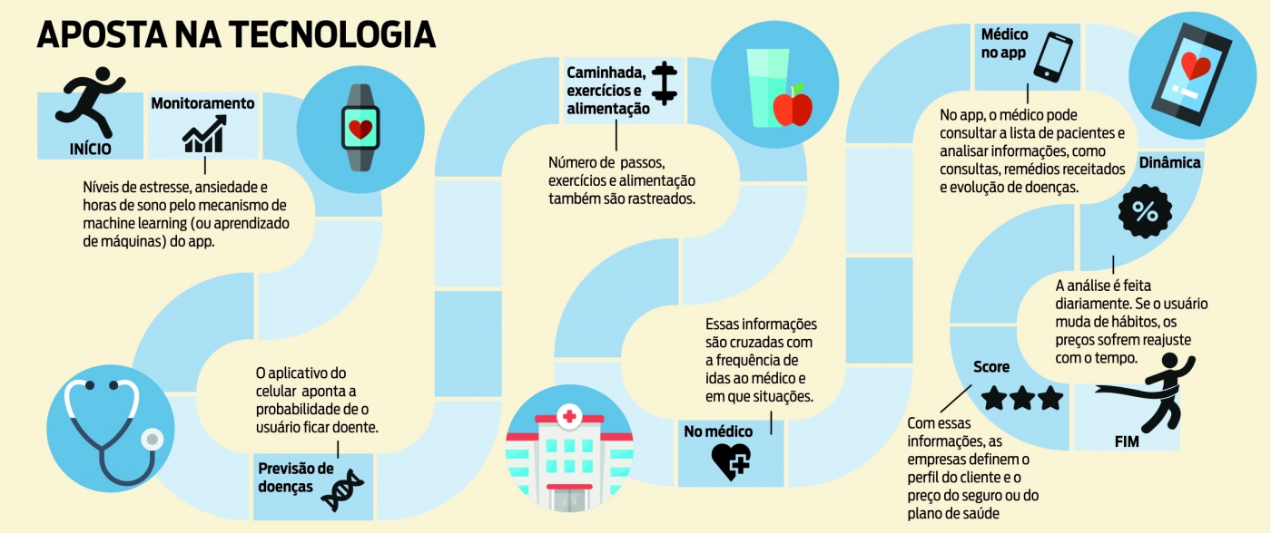 Em meio a um cenário de queda de beneficiários de planos de saúde no país, as empresas investem em tecnologia para resgatar clientes, apostando no incentivo a hábitos saudáveis para reduzir o preço repassado aos clientes. Aplicativos para celular aliados a seguradoras e a empresas de planos de saúde registram toda a rotina do cliente. E já podem até apontar a probabilidade do usuário adoecer. Níveis de estresse, ansiedade, horas de sono e práticas de exercício físico ajudam a traçar um perfil personalizado. Essas informações são cruzadas com a frequência de idas ao médico para indicar um valor cobrado ao segurado.