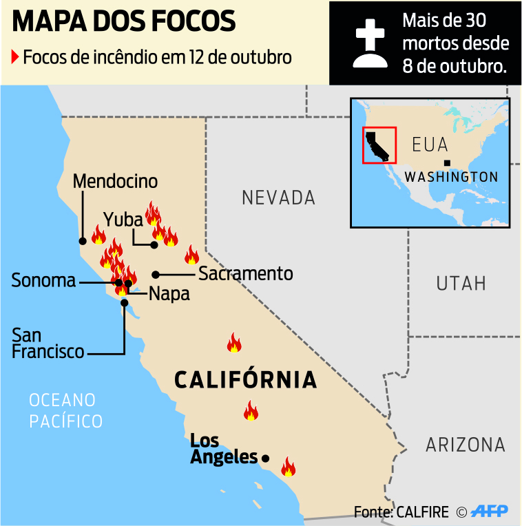 O número de mortos nos incêndios na Califórnia aumentou para 32 ontem, enquanto bombeiros conseguiram obter progresso em conter os focos de incêndio, embora os ventos intensos e velozes ainda preocupem. "Nós não saímos do estado de emergência, (não chegamos) nem perto disso", disse Mark Ghilarducci, diretor do Serviço de Emergência do gabinete do governador. "Porém, nós estamos vendo algum progresso em áreas já atingidas pelo incêndio", comentou Ghilarducci durante em entrevista.