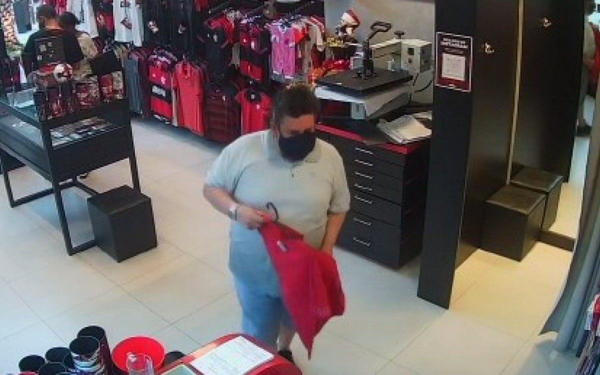 As imagens do circuito interno de segurança mostram a ação do homem, que se passou por cliente. Ele pediu uma camisa ao vendedor, que foi até o estoque buscá-la.