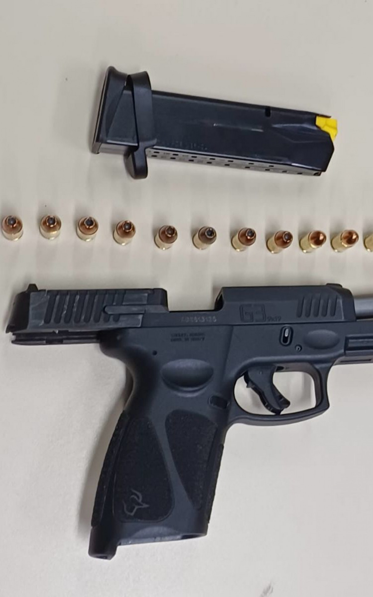 Ao perceber a aproximação dos agentes, o suspeito entrou em um veículo preto com vidros escurecidos. Antes que ele conseguisse sair do local, os policiais o pararam e revistaram o carro, onde foi encontrada uma pistola 9mm carregada com 14 cartuchos.