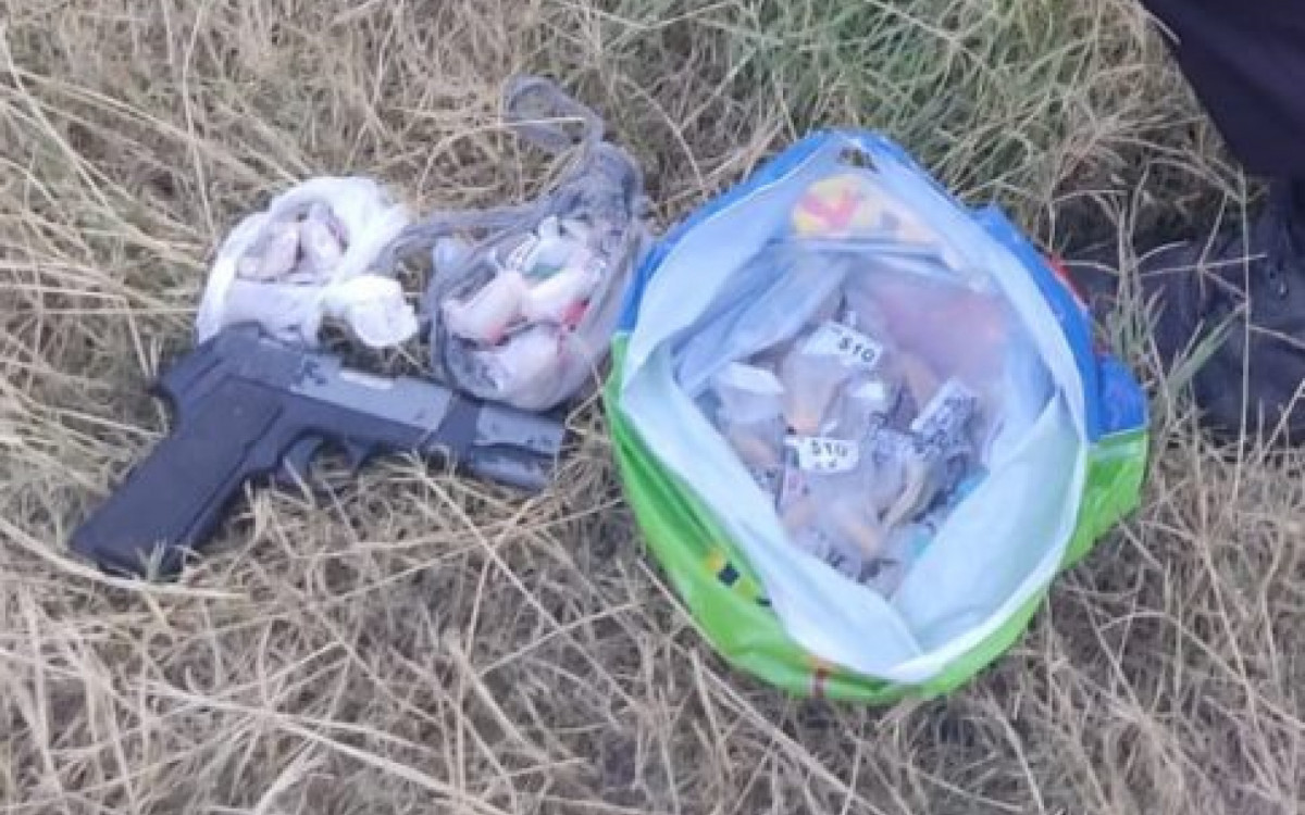 Após o breve confronto, os policiais efetuaram buscas pela localidade e localizaram 50 pinos de cocaína, 28 pedras de crack, 27 trouxinhas de maconha e um simulacro de pistola.