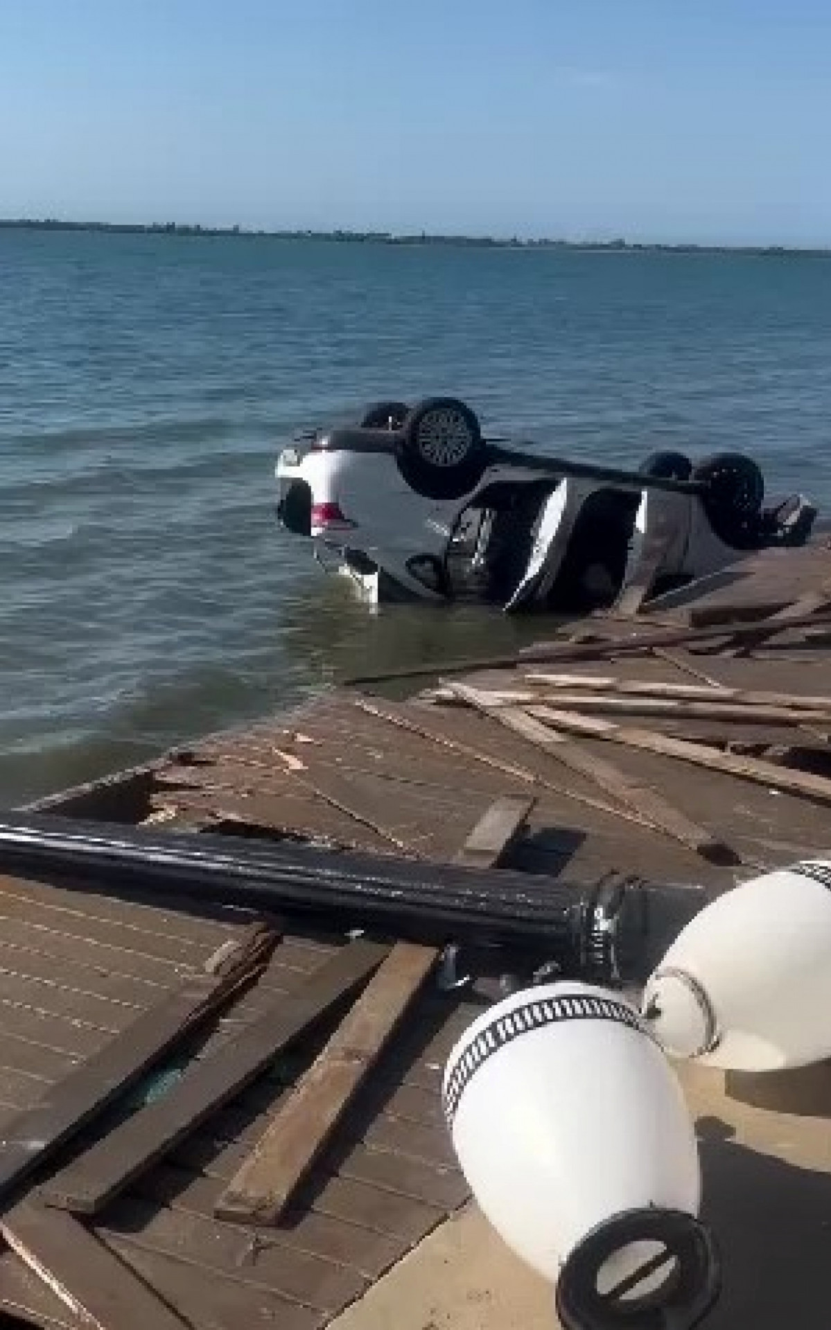 O veículo ficou de rodas para cima e parcialmente encoberto pela água. Parte da estrutura do deck ficou completamente destruída.