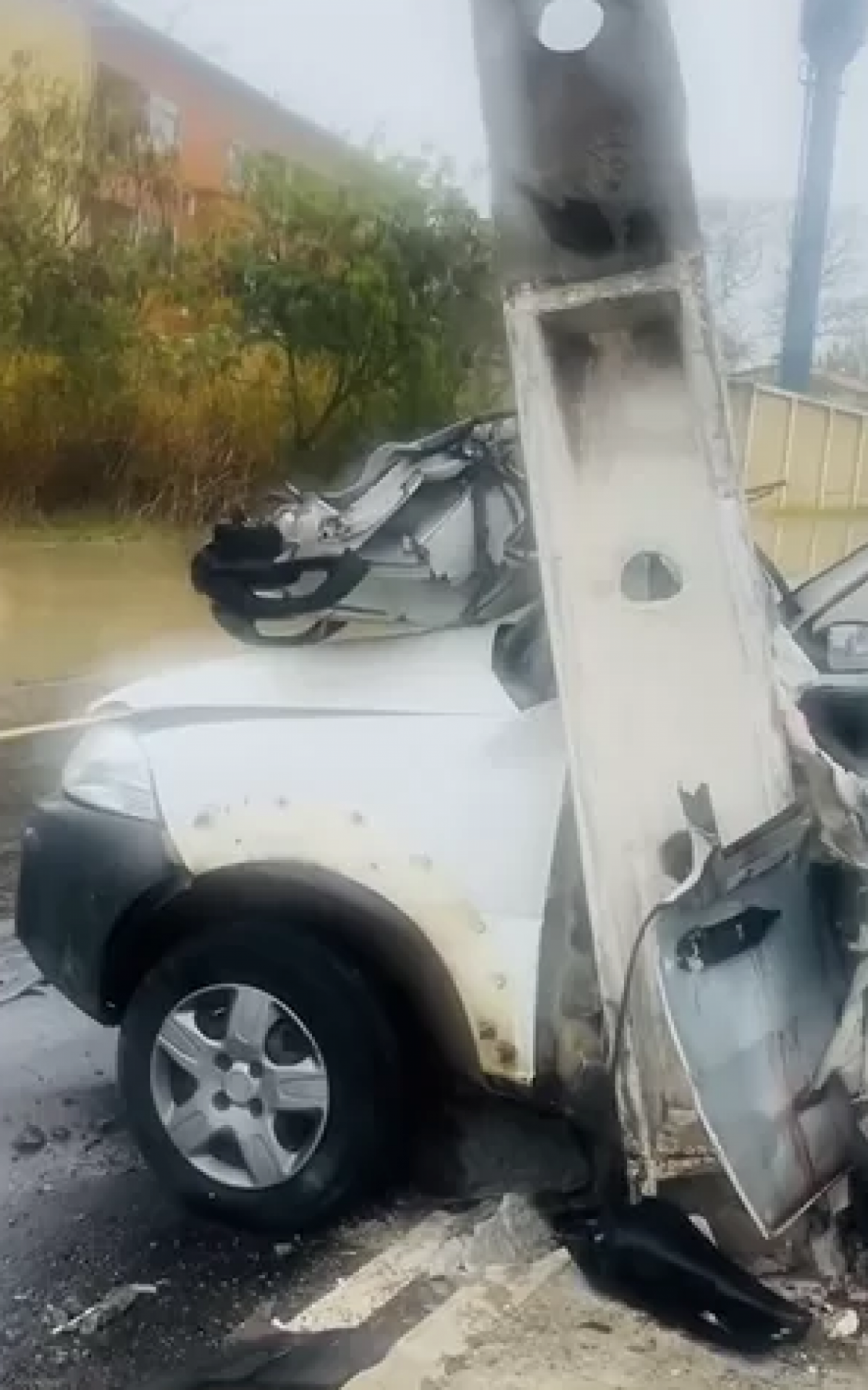 Apesar do resgate, o carro ainda permanece sobre a pista, o que representa risco de novos acidentes na via. Além disso, o poste atingido segue em risco de queda.