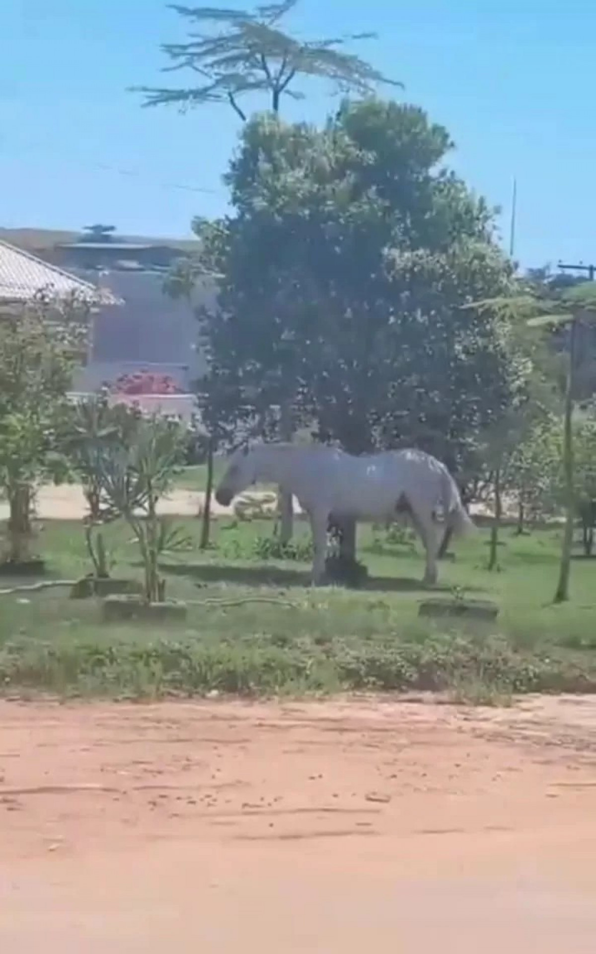 Segundo os moradores, a situação tem causado preocupação, já que o cavalo permanece exposto ao tempo e sem acesso regular a água e alimentação.