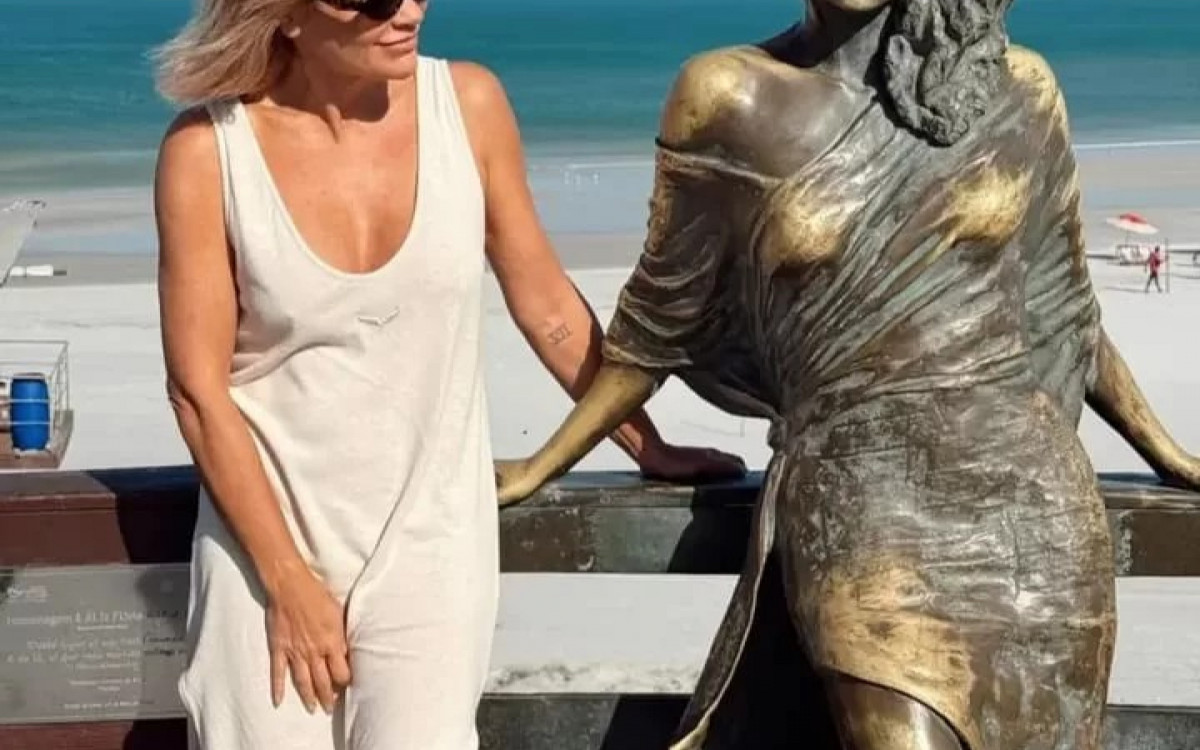 Ela foi eternizada com uma estátua na Praia Grande, em Arraial do Cabo, e celebrou o momento com um beijo na própria obra.