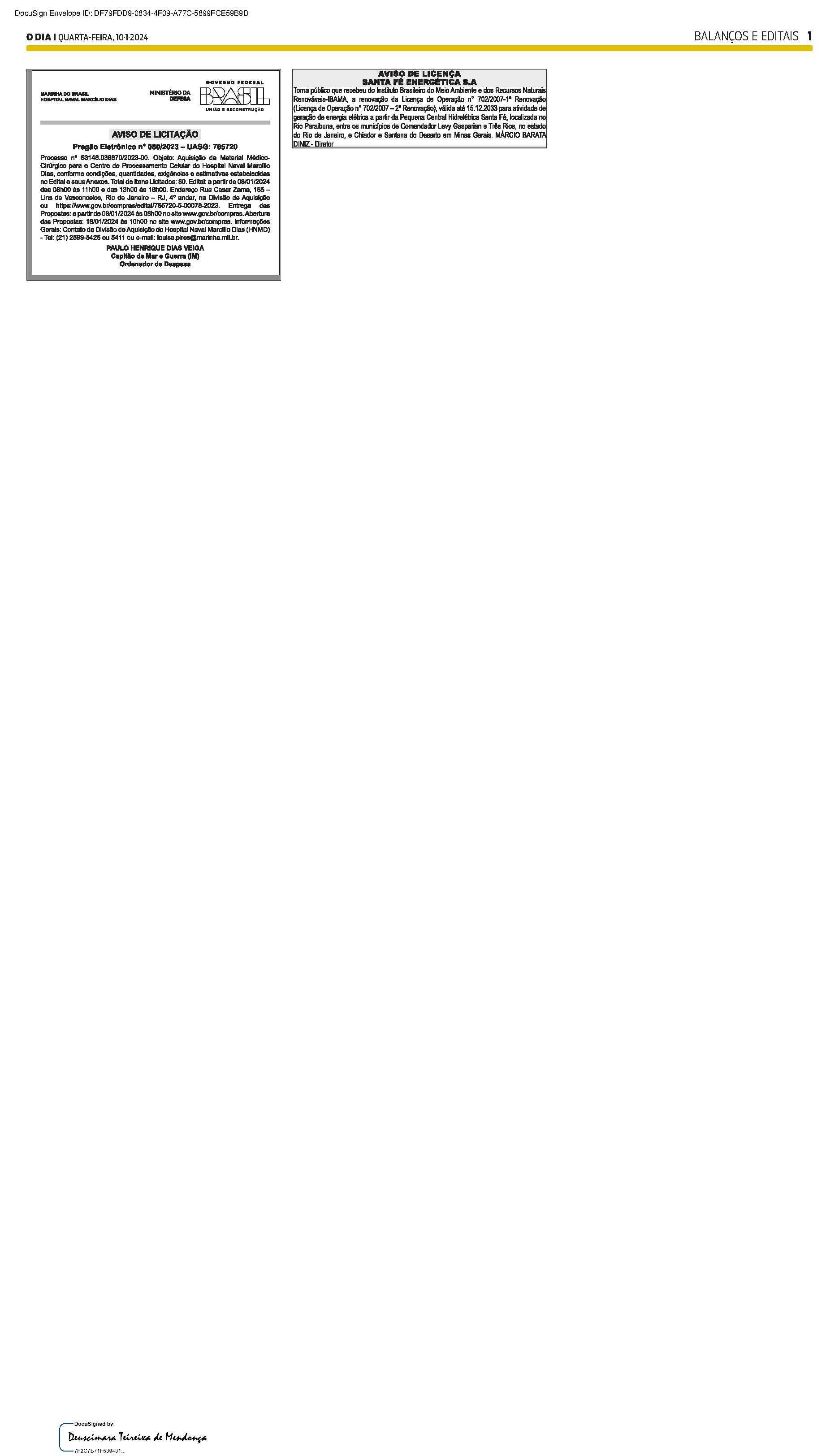 Balanços e Editais PUBLICAÇÃO CERTIFICADA 10/01/2024 PUBLICAÇÃO CERTIFICADA 10/01/2024 Publicado há 1 minuto