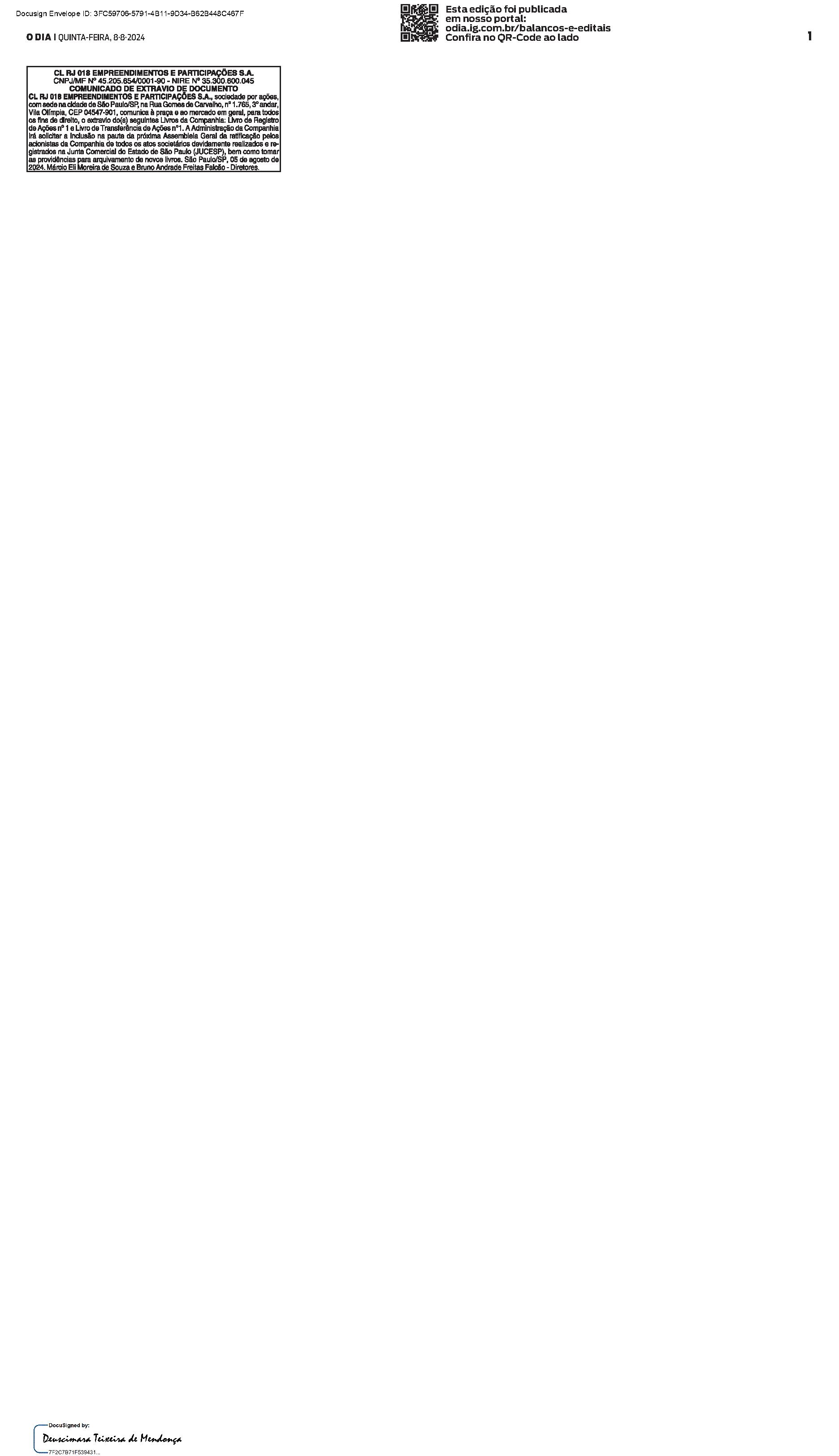 Balanços e Editais PUBLICAÇÃO CERTIFICADA 08/08/2024 PUBLICAÇÃO CERTIFICADA 08/08/2024 Publicado há 25 minutos