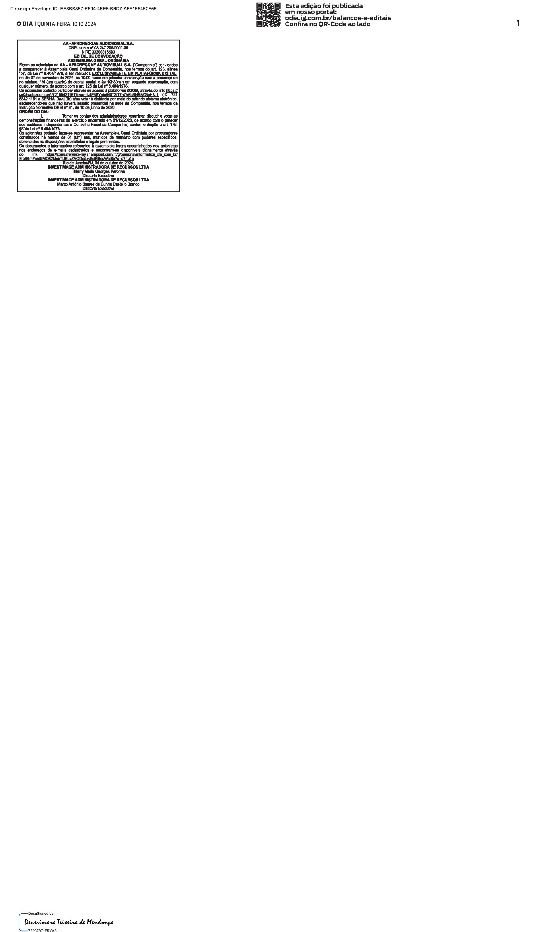 Balanços e Editais PUBLICAÇÃO CERTIFICADA 09/10/2024 PUBLICAÇÃO CERTIFICADA 09/10/2024 Publicado há 1 dia