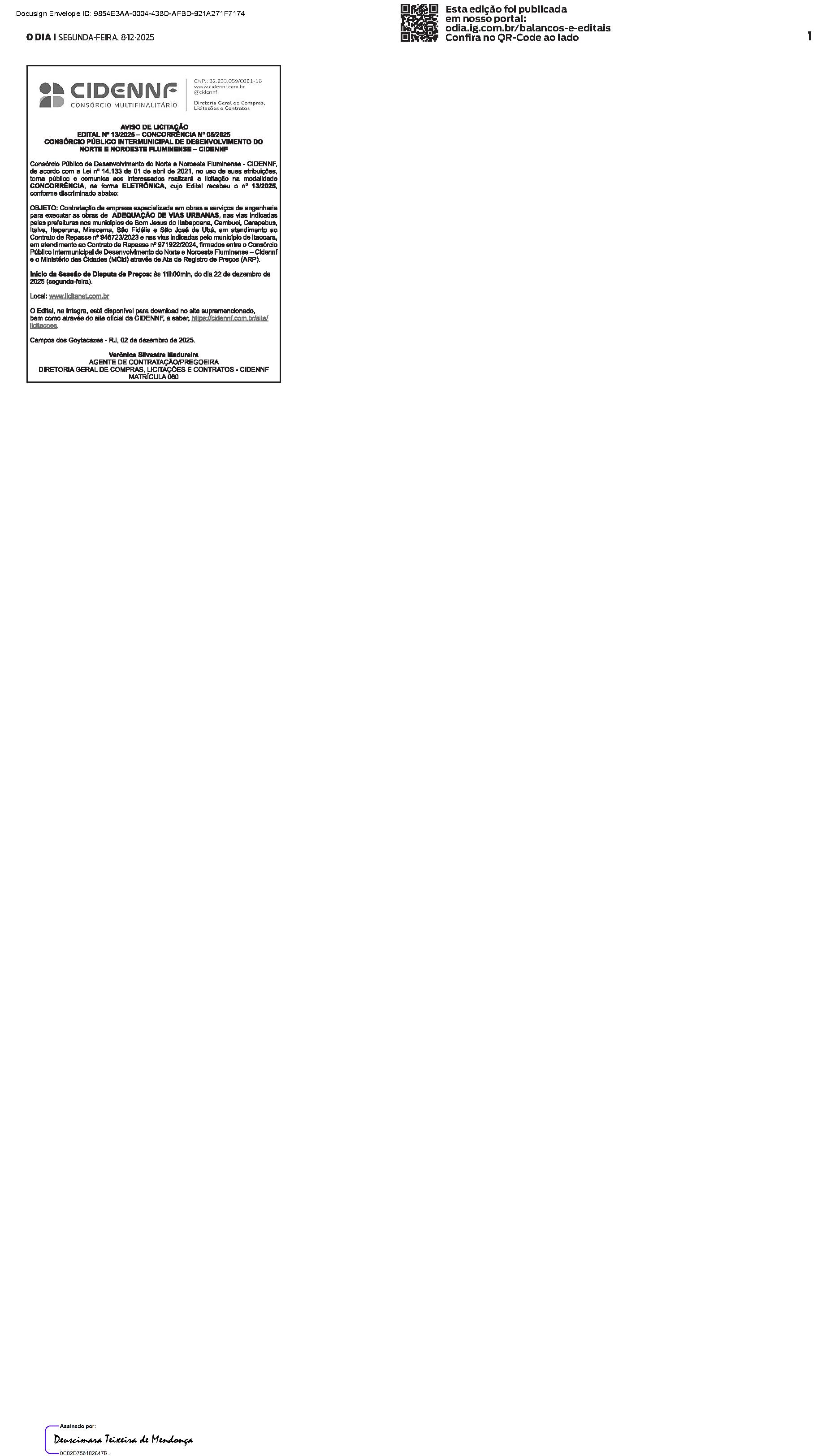 Balanços e Editais PUBLICAÇÃO CERTIFICADA 08/12/2025 PUBLICAÇÃO CERTIFICADA 08/12/2025 Publicado 08/12/2025 00:00 | Atualizado há 1 segundo