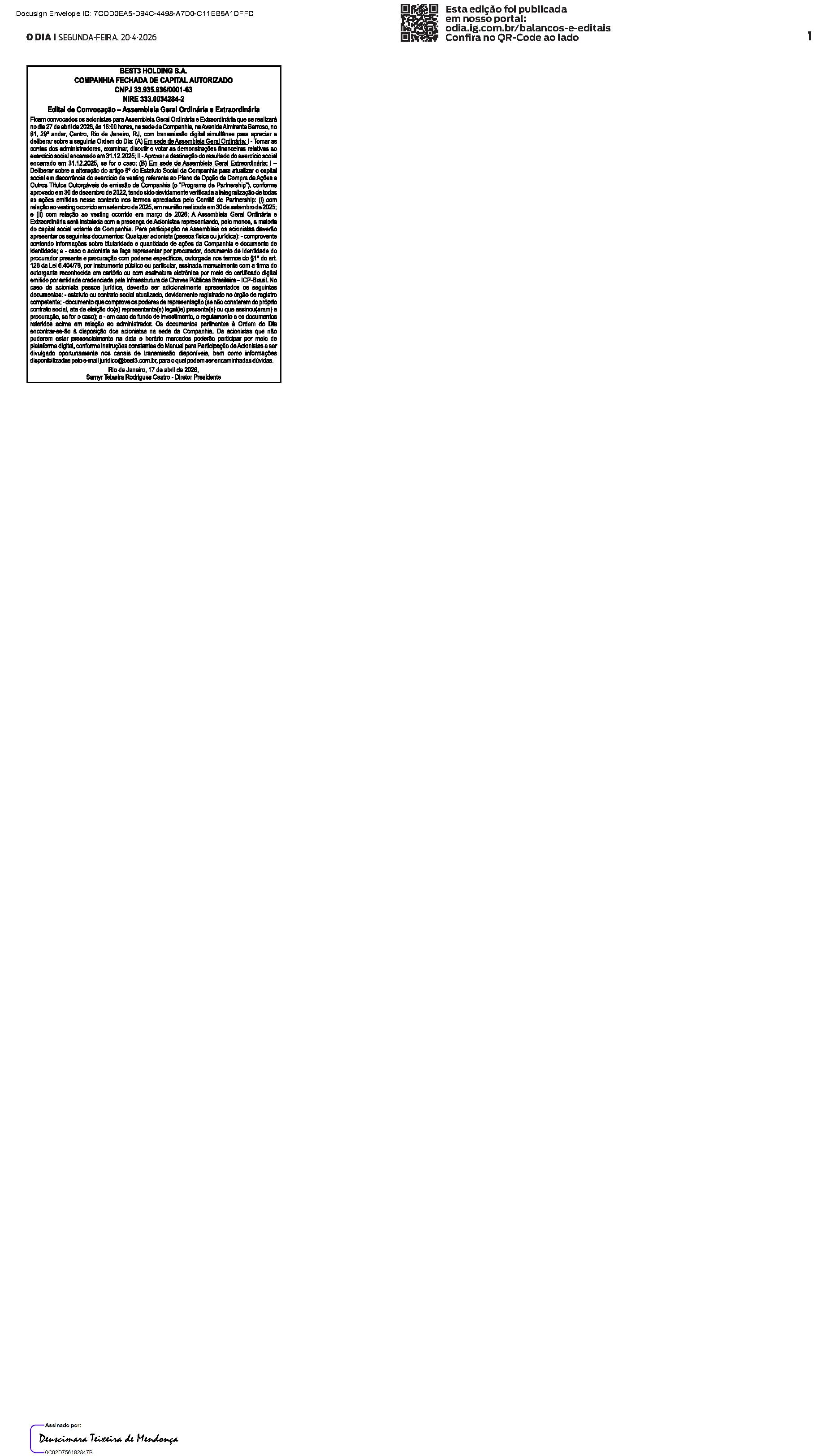 Balanços e Editais PUBLICAÇÃO CERTIFICADA 17/04/2026 - COMPLEMENTO PUBLICAÇÃO CERTIFICADA 17/04/2026 - COMPLEMENTO Publicado 17/04/2026 00:00 | Atualizado há 3 dias