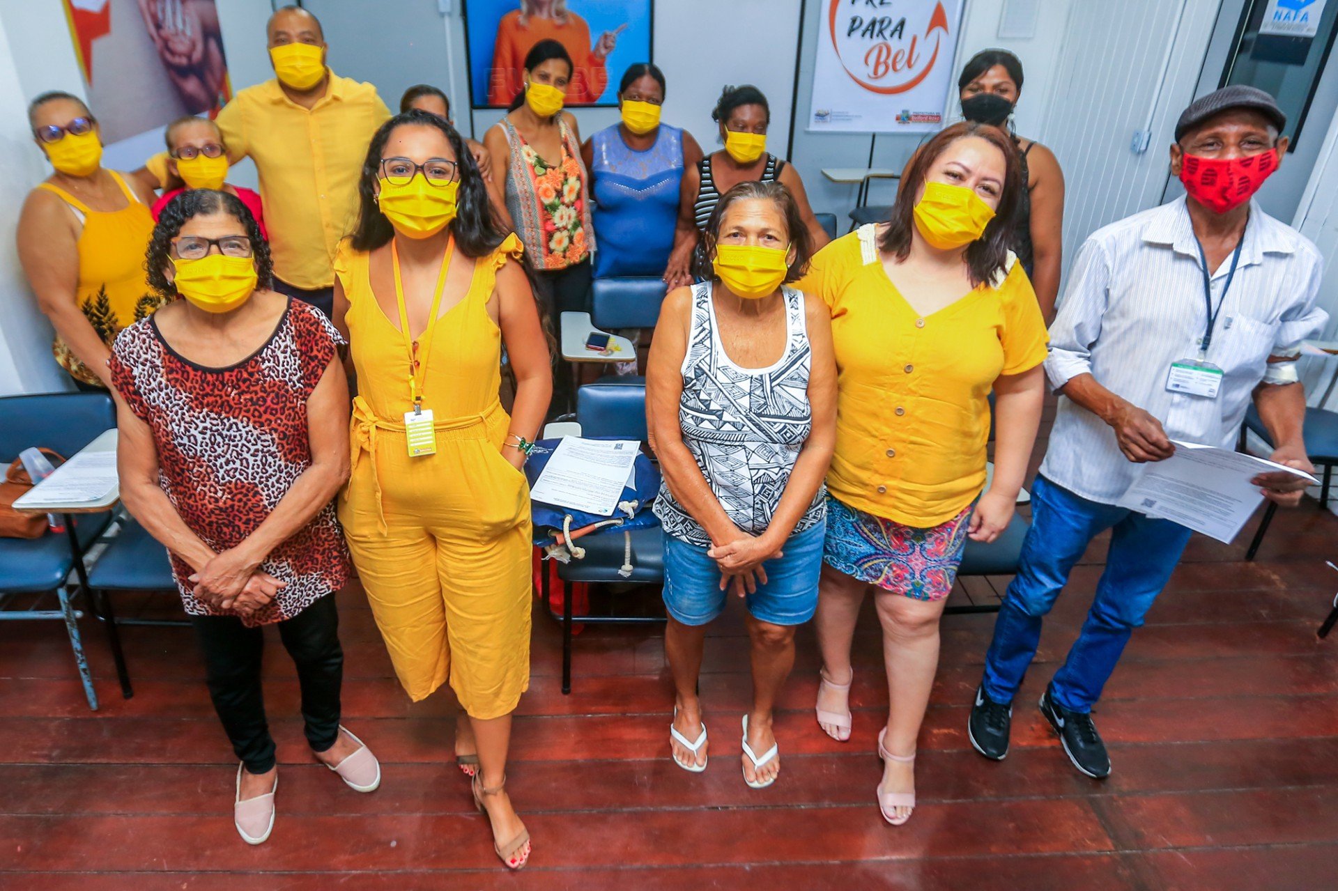 As advogadas Janaína Neves e Rouzinete Oliveira (à frente) com os agraciados com a carta de concessão do INSS - Rafael Barreto / PMBR