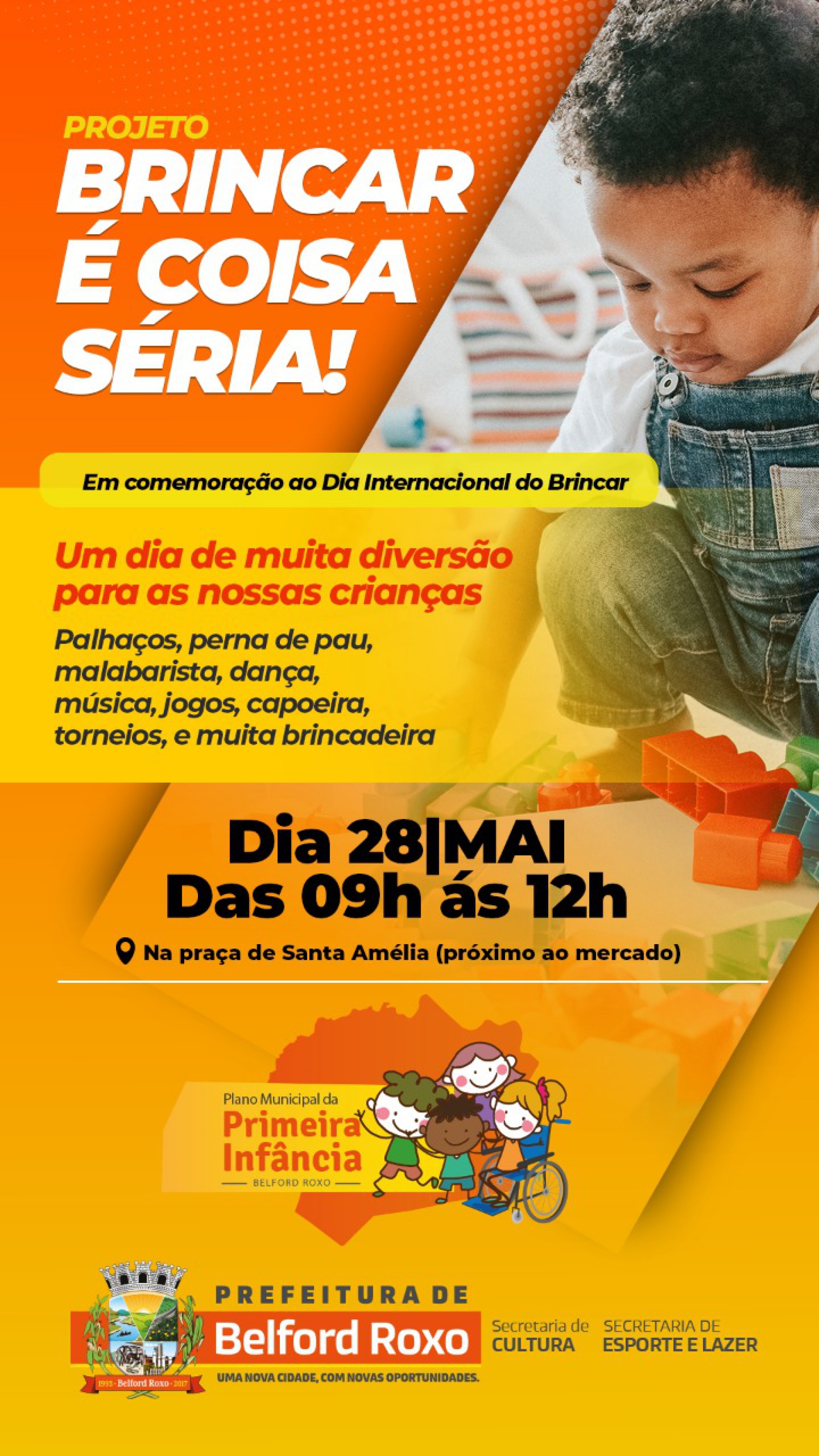 Belford Roxo – A Prefeitura de Belford Roxo preparou uma programação especial para comemorar neste sábado (28/05), o Dia Internacional do Brincar, com o projeto ‘Brincar é Coisa Séria’. A ação acontecerá das 9h às 12h, na Praça de Santa Amélia, próximo ao mercado, com apoio das secretarias municipais de Esporte e Lazer e Cultura.