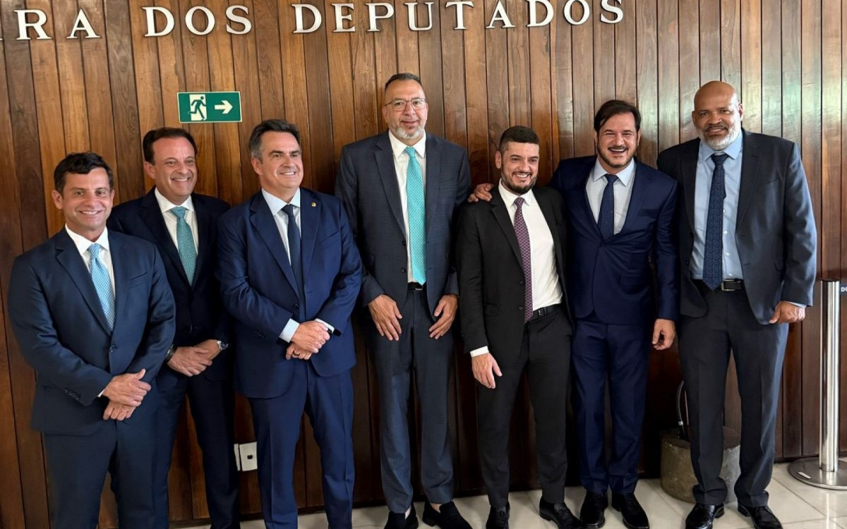 O prefeito Márcio Canella (4º da esquerda para a direita) com líderes do Progressistas e União BrasilDivulgação