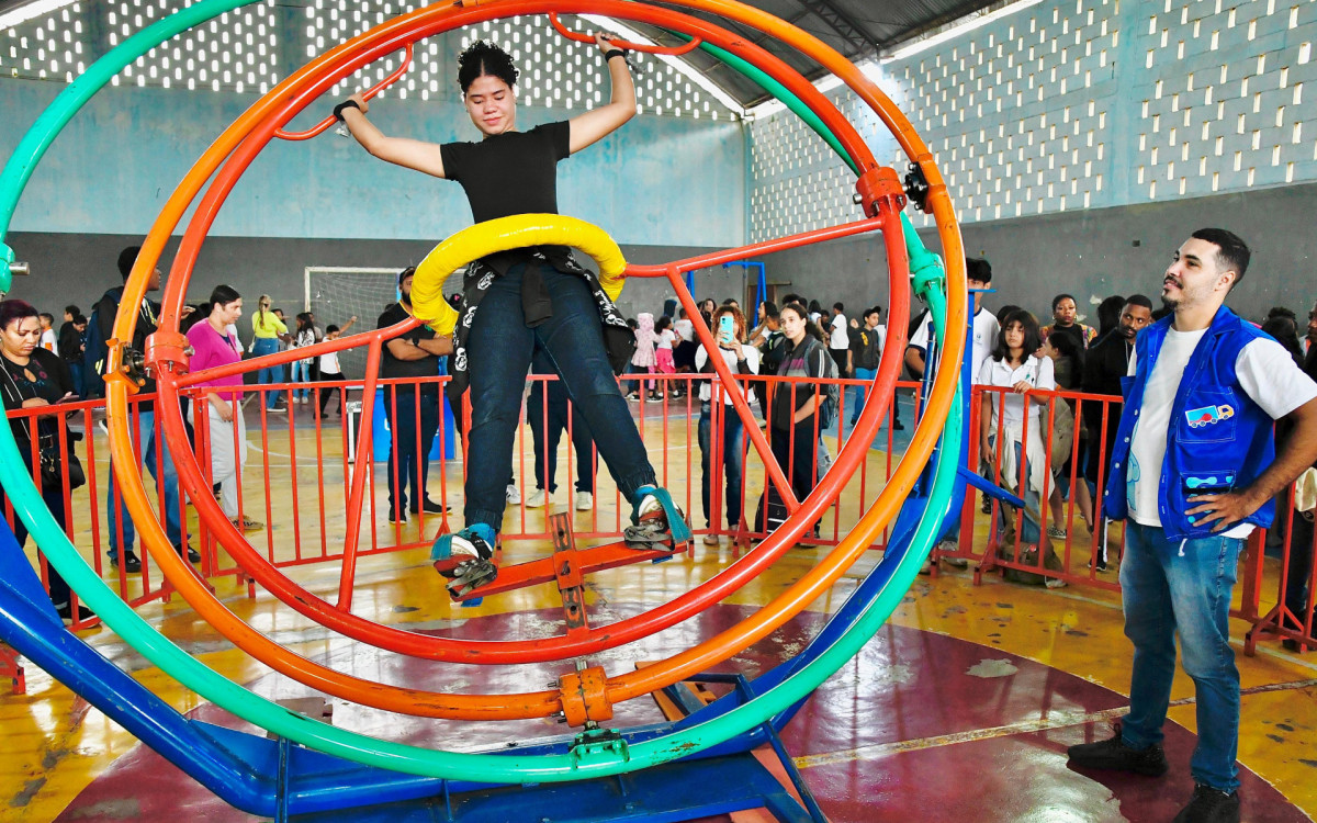 “Deu um pouco de medo de girar no Girotec, mas depois que relaxei, foi muito legal a sensação. O projeto é sensacional”, afirmou Júlia Vasconcelos, de 17 anos, aluna do CIEP 178 João Saldanha (Sargento Roncalli), que aproveitou para se divertir no Giroscópio Humano.