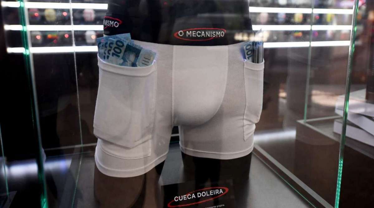 Brasília - Tornozeleiras eletrônicas douradas ou de couro com tachinhas, manuais para delatar cúmplices e roupa íntima com bolsos cheios de dinheiro. As "lojas da corrupção" montadas pela Netflix em aeroportos do Brasil têm tudo para criminosos do colarinho branco.