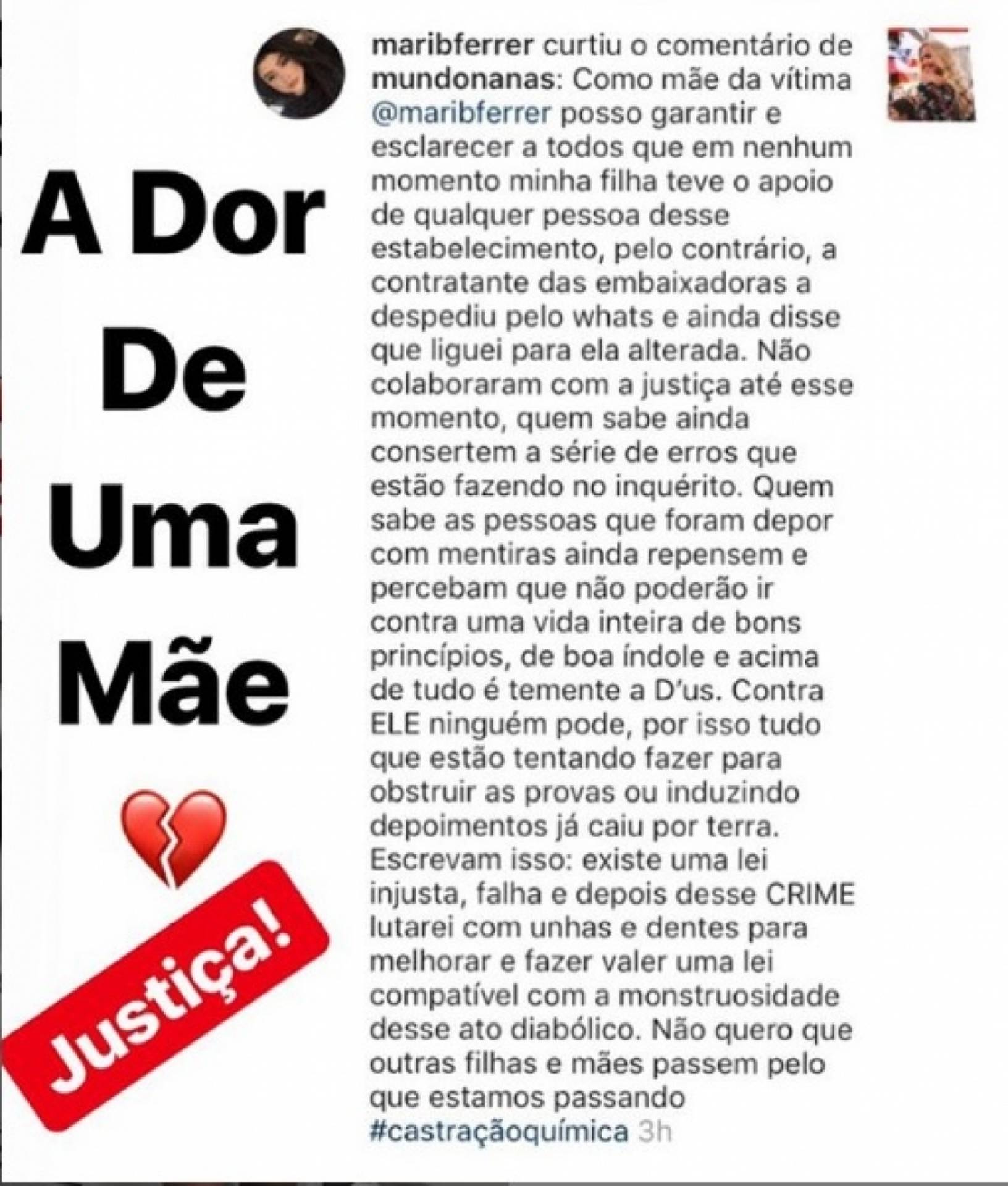 "Posso garantir que em nenhum momento minha filha teve o apoio de qualquer pessoa desse estabelecimento, muito pelo contrário. Não colaboraram com a Justiça até este momento. Quem sabe ainda consertem a série de erros que estão fazendo no inquérito", escreveu. Ela também disse que vai lutar com 'unhas e dentes' pelo endurecimento das penas para o crime de estupro.