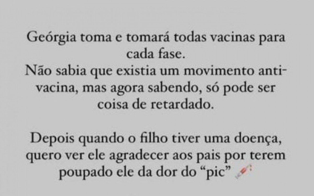 Heloísa respondeu que “Geórgia toma e tomará todas as vacinas para cada fase. Não sabia que existia um movimento anti-vacina, mas agora sabendo, só pode ser coisa de retardado”. “Depois, quando o filho tiver uma doença, quero ver ele agradecer aos pais por terem poupado ele da dor do ‘pic’. Pqp, né? Por essas e outras a gente vê a volta de doenças antes erradicadas”, complementou.