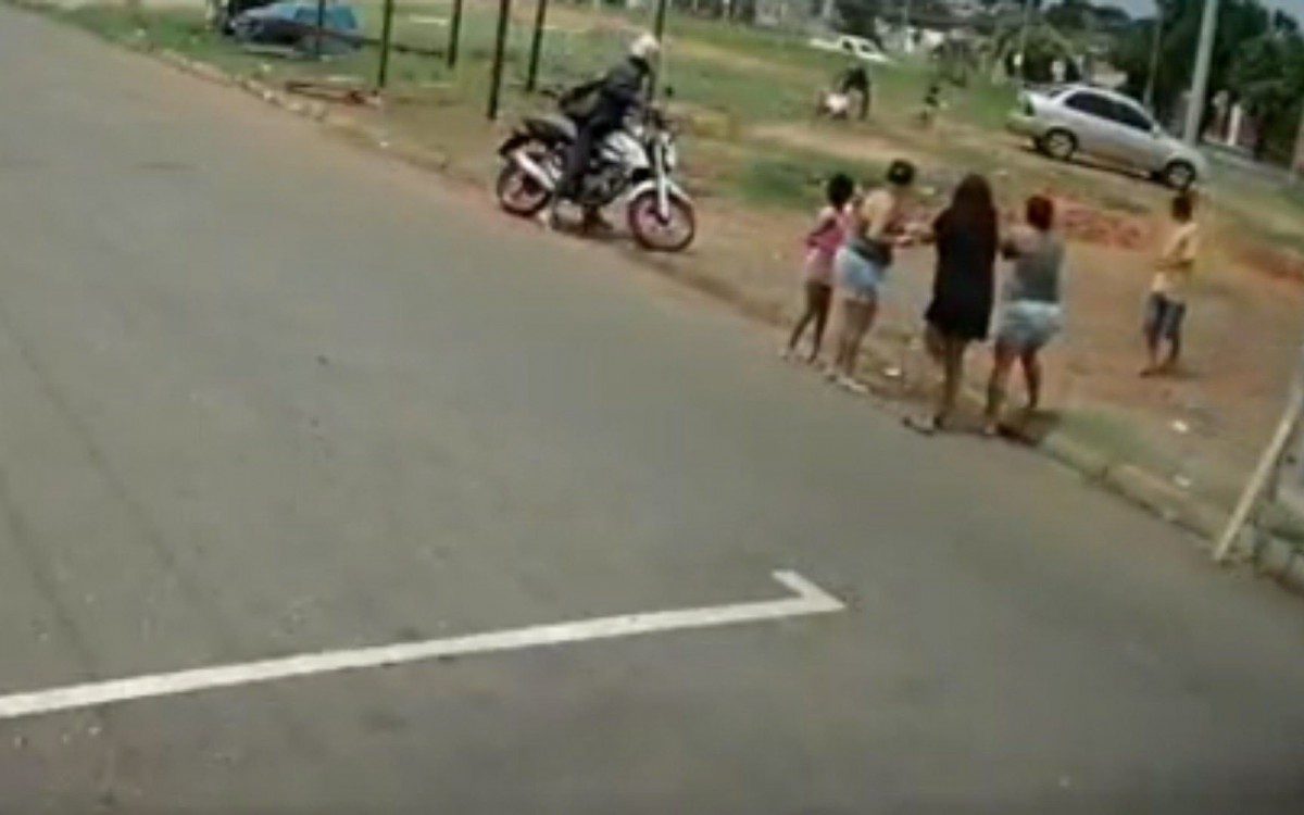 O carro deixa o local e o filho volta para a mãe caída ao chão. Uma moradora tira a criança de perto de Bruna e um motociclista que estava no local parece acionar a emergência.