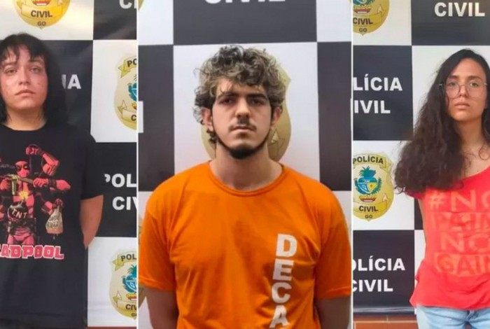 Raíssa Borges foi presa pela Polícia Civil com outros dois suspeitos: Enzo Jacomini e Jeferson RodriguesReproduções/TV Anhanguera/Polícia Civil de Goiás