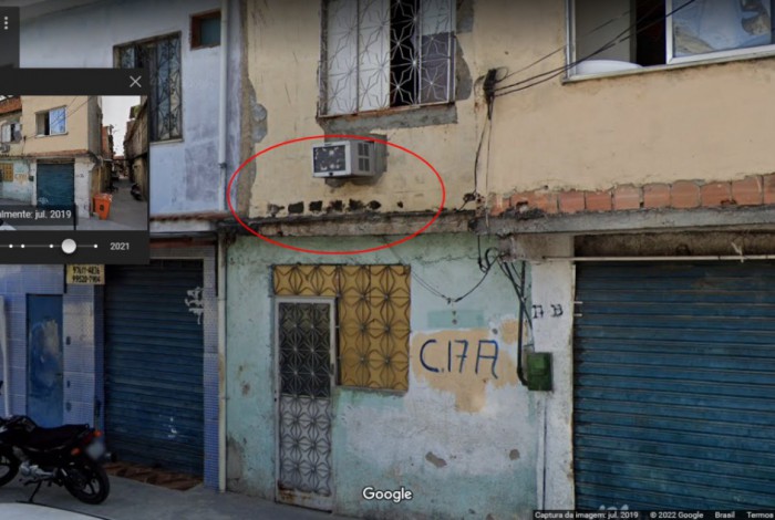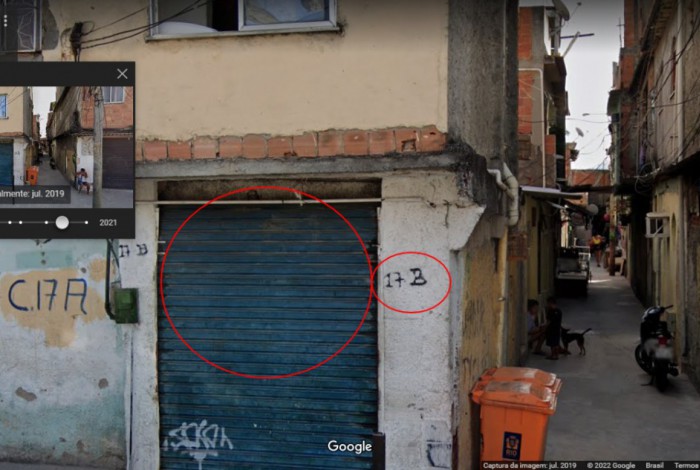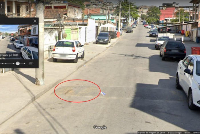 Com o nome da rua, nós fizemos uma busca no Google Street View por elementos que aparecem no vídeo, para tentar confirmar se a via era a mesma indicada pelo político. No ponto onde a gravação que viralizou começa, Paes está próximo a um poste com uma pintura, na frente de dois estabelecimentos com toldos de plástico. Os mesmos elementos podem ser vistos nas imagens do Google feitas na rua Arquimedes.