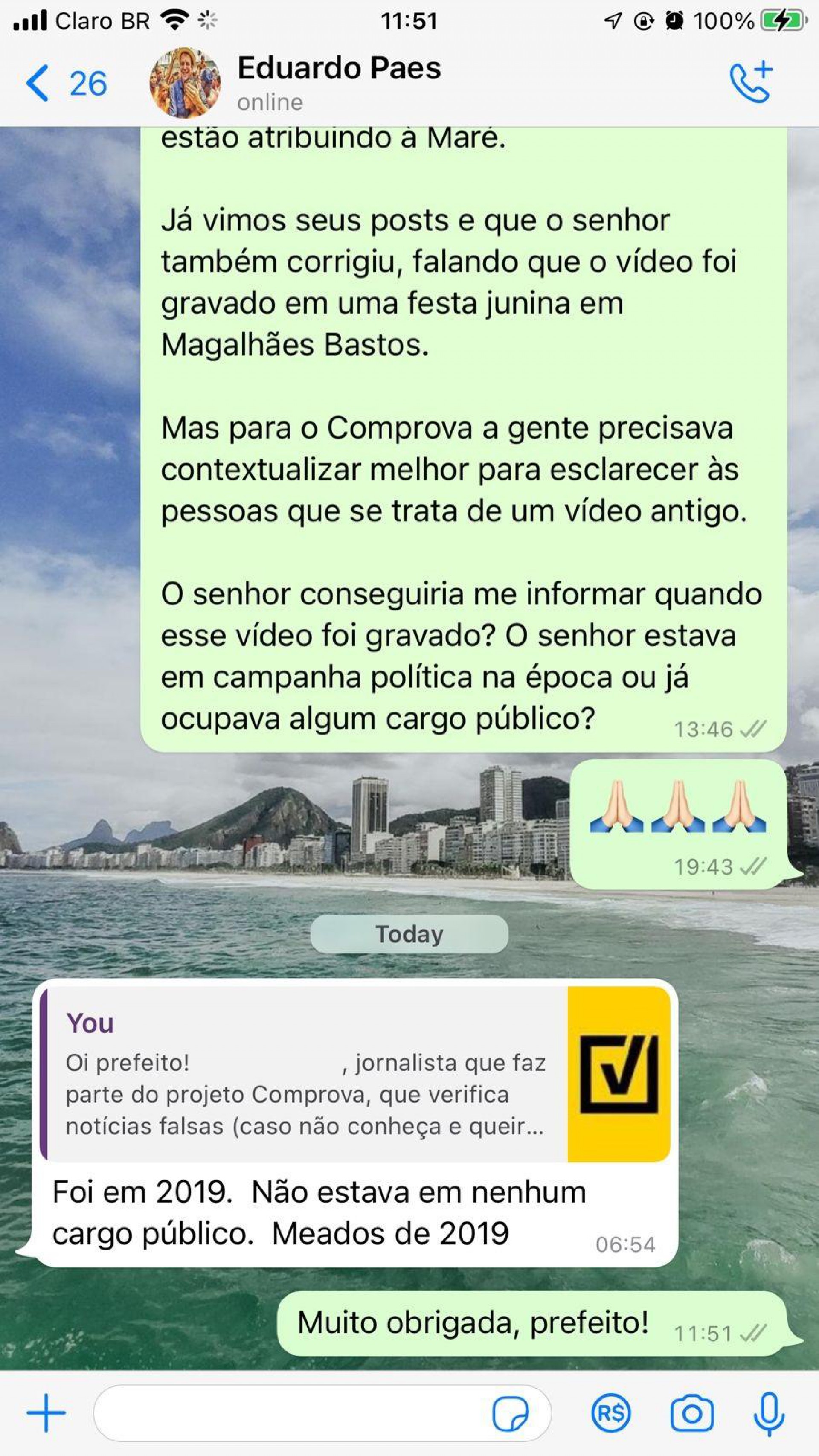 Um sinal de que o vídeo não é recente é que, no áudio, entre 14 e 17 segundos, é possível ouvir uma mulher pedindo a Eduardo Paes para “voltar para a prefeitura”, o que aponta que ele foi filmado entre 2017 e 2020, período entre os mandatos do prefeito, que já havia ocupado o mesmo cargo entre 2009 e 2016.