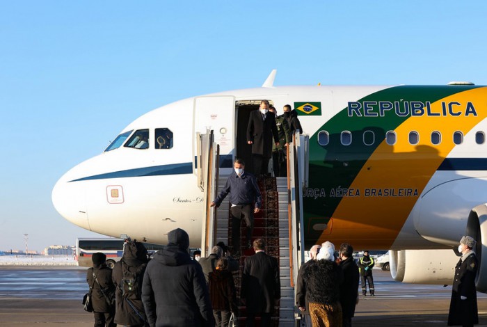 Numa rara aparição de máscara, o presidente Jair Bolsonaro desembarca no avião presidencial para o encontro do Vladmir Putin, na RússiaDivulgação/Palácio do Planalto
