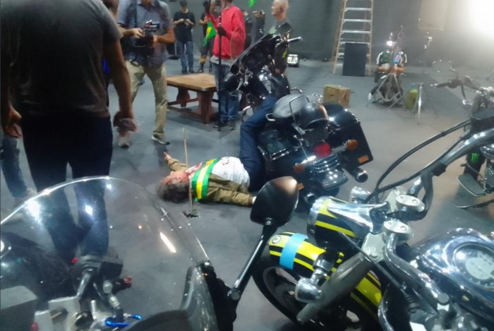 Nas imagens compartilhadas, o personagem com a faixa presidencial está deitado no chão, com uma espécie de flecha que atravessa sua garganta. Ao fundo é possível ver equipes com material de gravação, câmeras, iluminação e um cenário. Ainda não há informações sobre a autoria da produção.