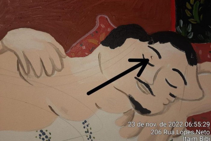 Obra do artista Antonio Kuschnir foi perfurada por uma lamina e foi levada pela perícia para investigaçõesReprodução/CCD