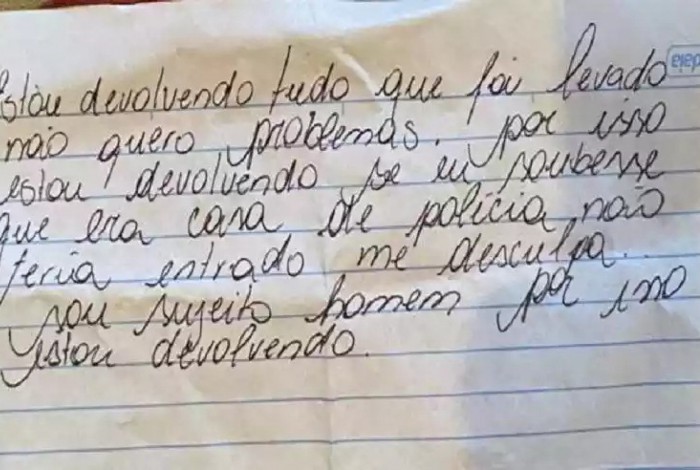 "Estou devolvendo tudo que foi levado, não quero problemas. Se soubesse que era casa de polícia, não teria entrado. Me desculpa. Sou sujeito homem, por isso, estou devolvendo", diz o bilhete escrito à mão.