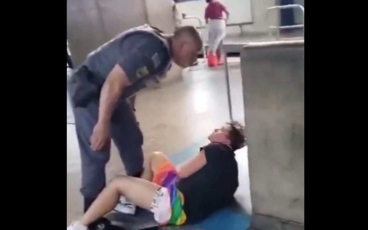Os dois discutem até que o policial dá um tapa no rosto da pessoa. No vídeo, é possível ouvir o barulho da agressão. A pessoa agredida usava uma bermuda com as cores da bandeira LGBT+.