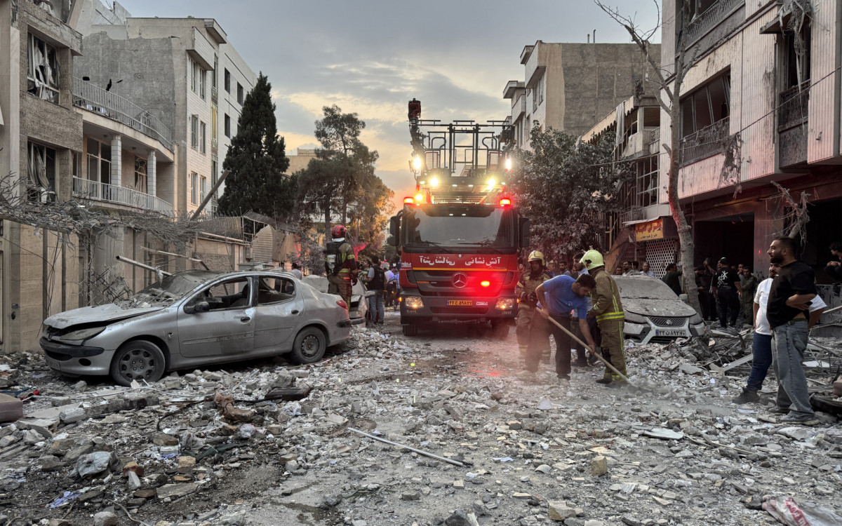 Equipes de emergência se reúnem em frente a um prédio atingido por um ataque israelense em TeerãAFP
