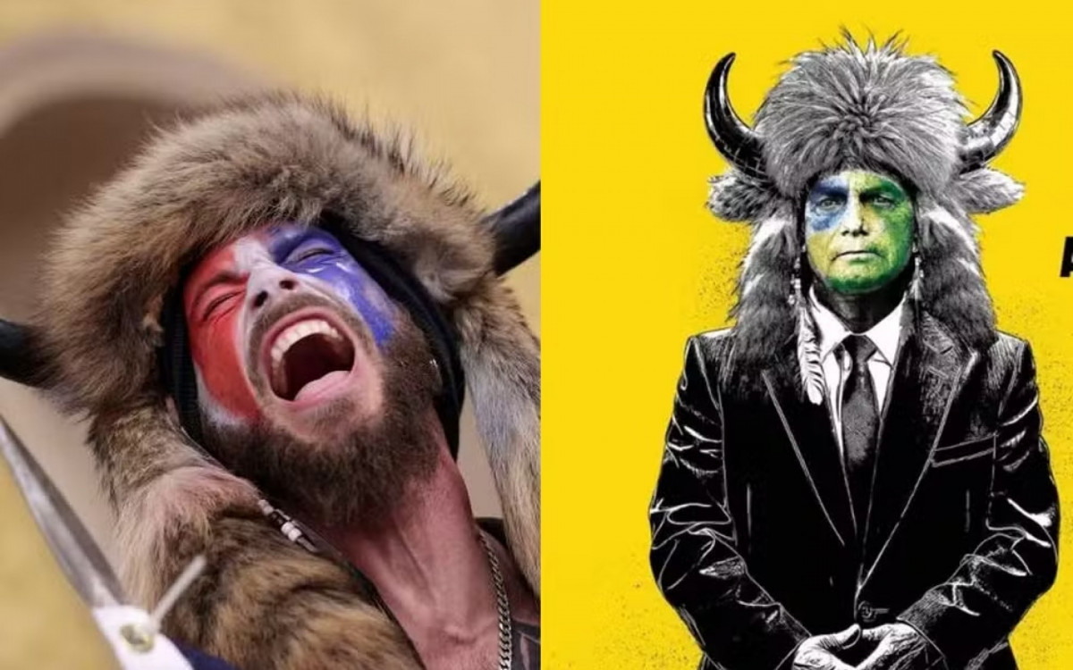 Na capa da revista The Economist que chegou às bancas nesta quinta-feira, 28, Bolsonaro foi retratado com o mesmo chapéu de pelos e chifres usado por Chansley. No rosto, no lugar da bandeira dos EUA, o presidente leva as cores do Brasil, com brincos de pena.