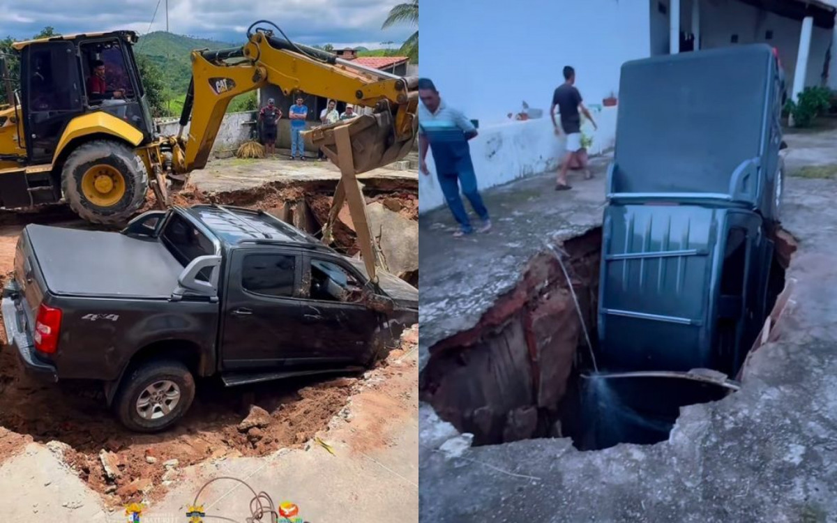 Chão cede e caminhonete de padre é 'engolida' por buraco no Ceará.