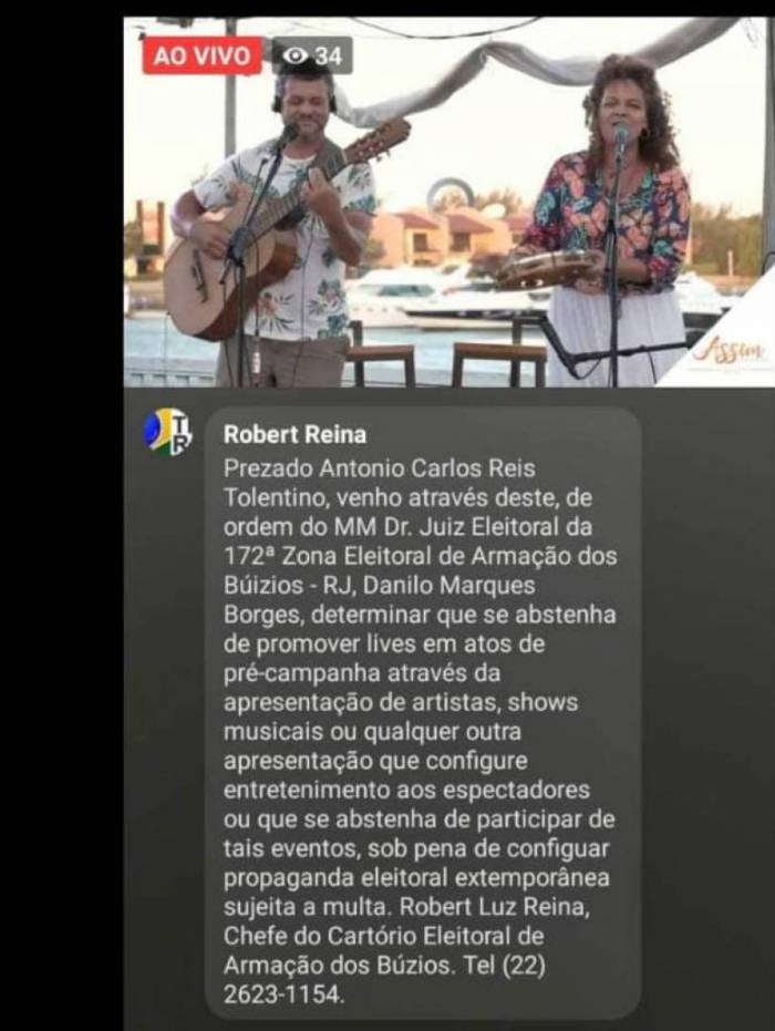Búzios - O Tribunal Regional Eleitoral do Rio de Janeiro (TRE-RJ) intima em uma live em que participava com artistas, ao vivo, neste domingo (30) o político Tolentino Reis, do Podemos, por estar divulgando e promovendo a sua pretensa candidatura a Prefeito do município de Armação dos Búzios.