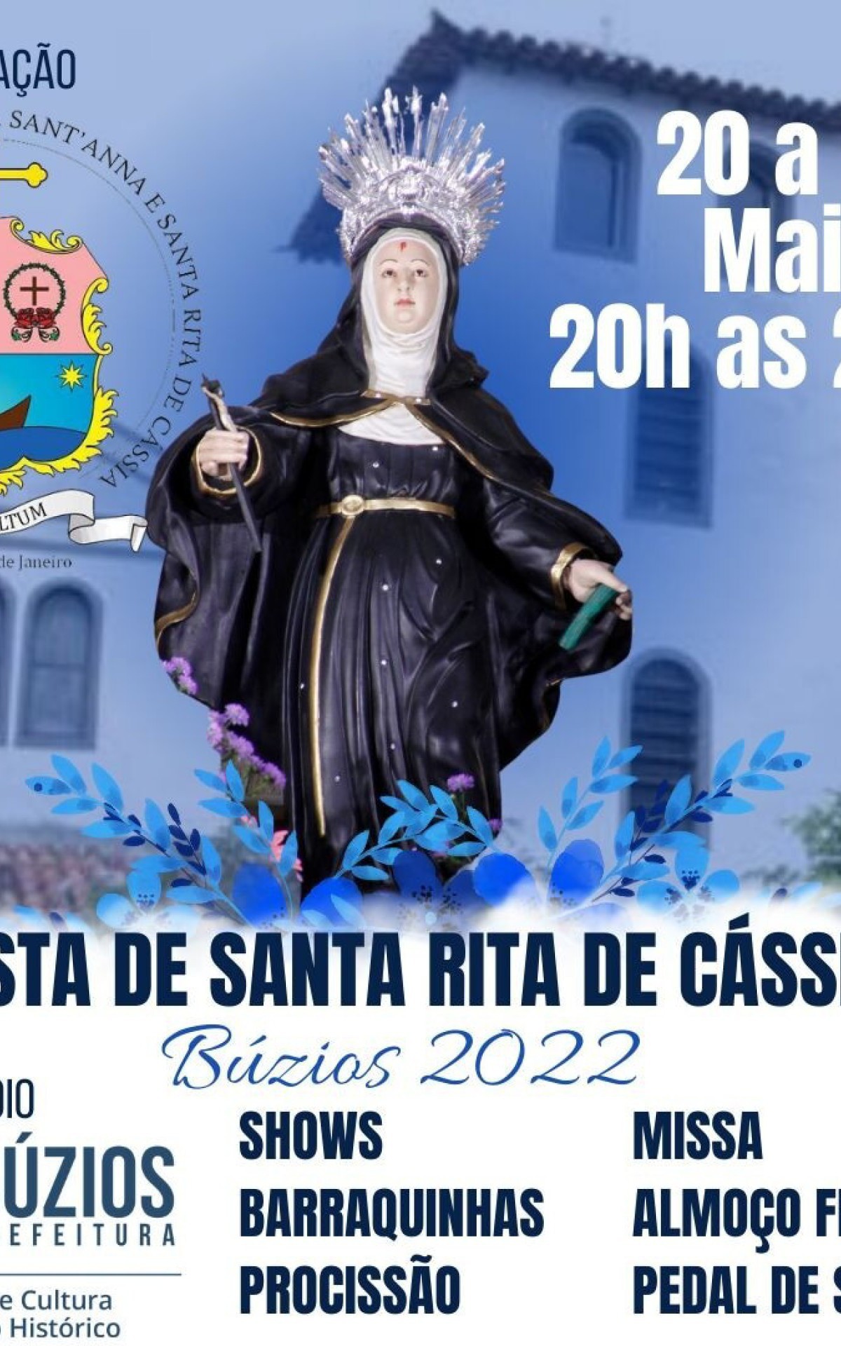 Búzios - A tradicional Festa de Santa Rita de Cássia do município de Búzios, realizada pela Paroquia de Sant’Anna e Santa Rita de Cássia em parceria com a Prefeitura, por meio da Secretaria de Cultura e Patrimônio Histórico de Búzios será celebrada com vasta programação neste final de semana, em Manguinhos.