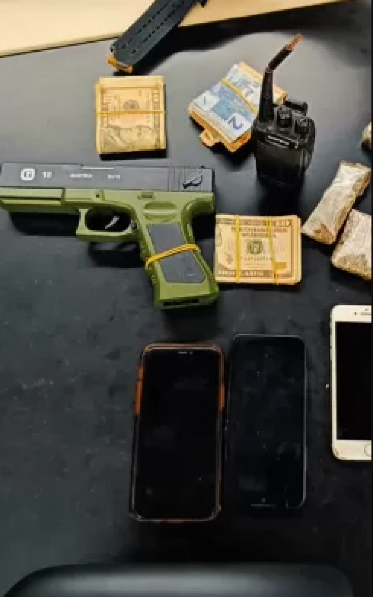 Ainda no decorrer da operação, os policiais prenderam em flagrante Y.L.V.P., de 21 anos, com anotações criminais por tráfico de drogas. Com ele, foram apreendidos material entorpecente, um simulacro de arma de fogo, aparelhos celulares, dinheiro em espécie e cédulas de moedas estrangeiras, como dólar, euro e libra.