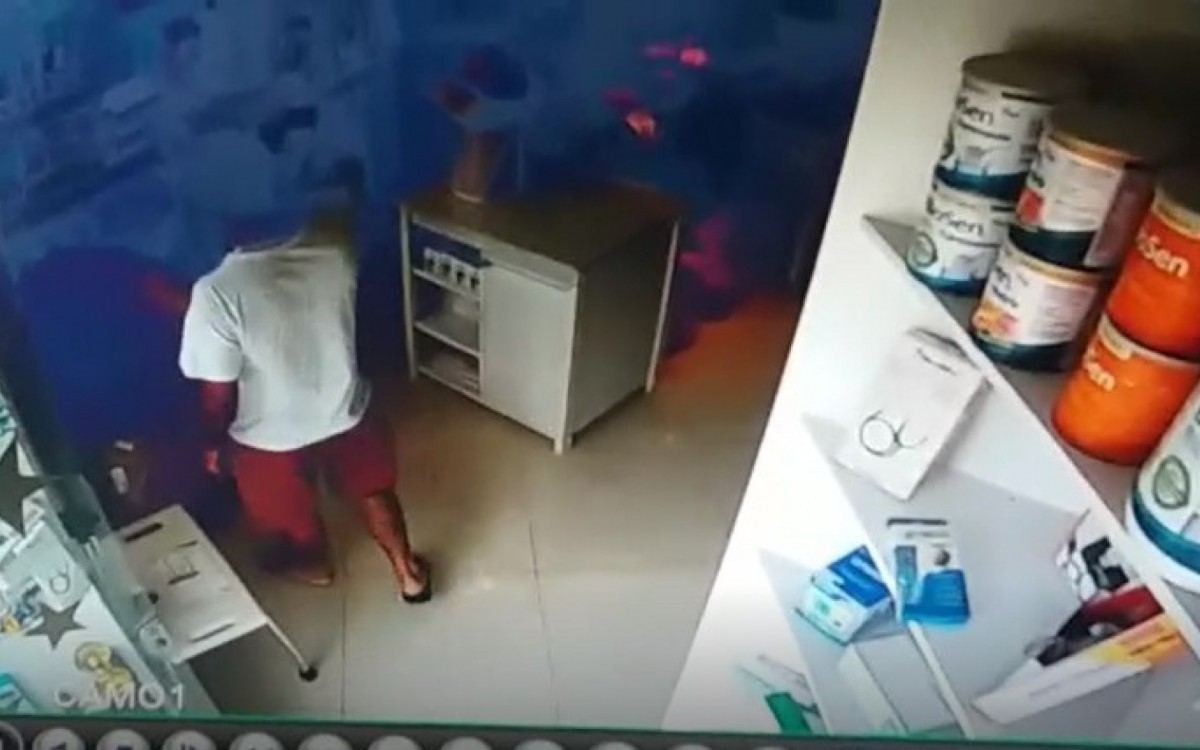 Nas cenas de uma das câmeras, o suspeito aparece agitado, se apoia no balcão, depois olha para o lado das gôndolas dos produtos e volta a olhar para onde está o vendedor. Se vira novamente, ajeita a bermuda e continua inquieto.