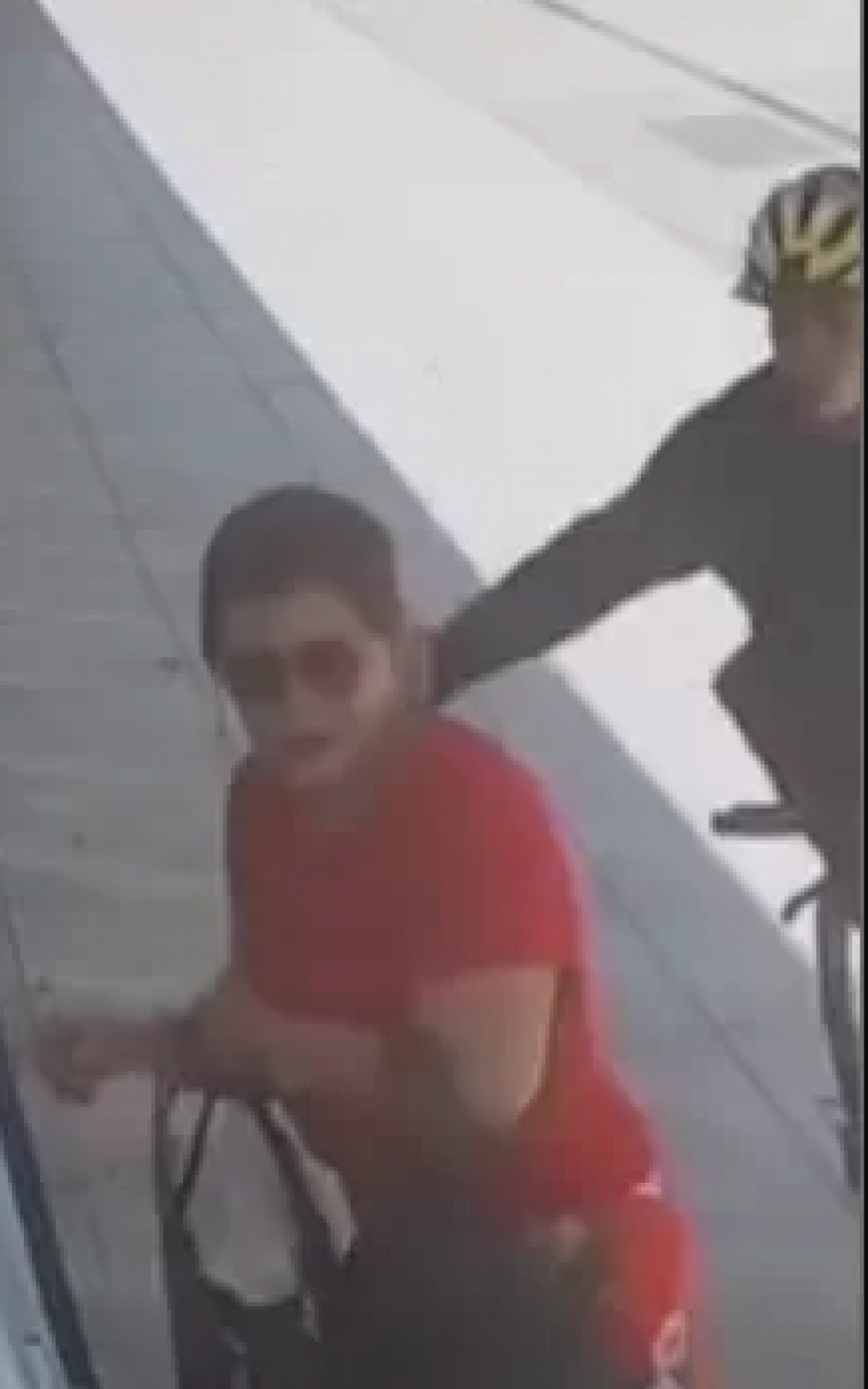 Nas imagens, é possível ver o momento em que um homem em uma bicicleta se aproxima de uma mulher que tentava abrir a porta de um centro comercial. Ele tenta arrancar o cordão do pescoço da vítima e foge logo em seguida. Toda a ação dura cerca de três segundos.