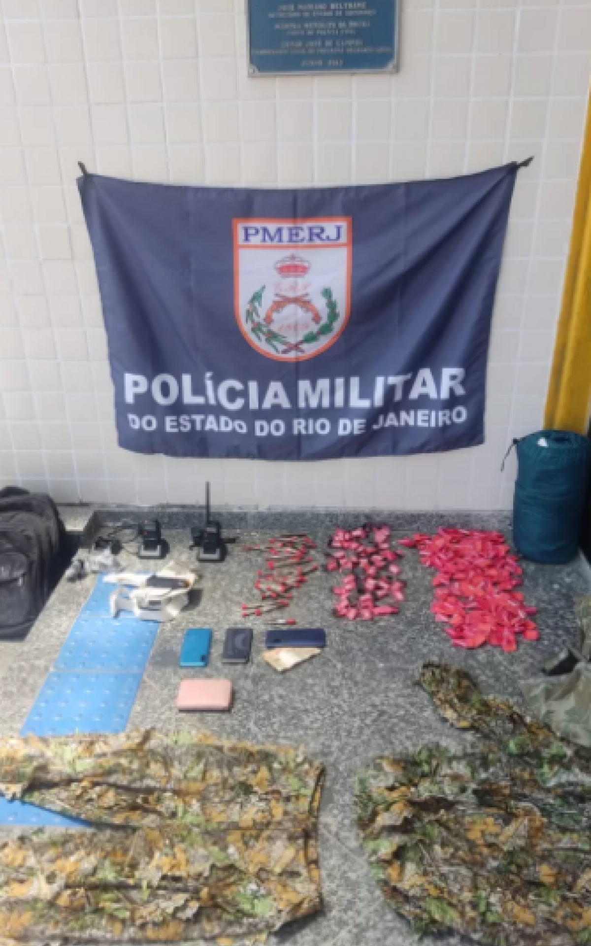 65 pinos de cocaína, 41 tiras de maconha e equipamentos usados pelo tráfico Divulgação/PM
