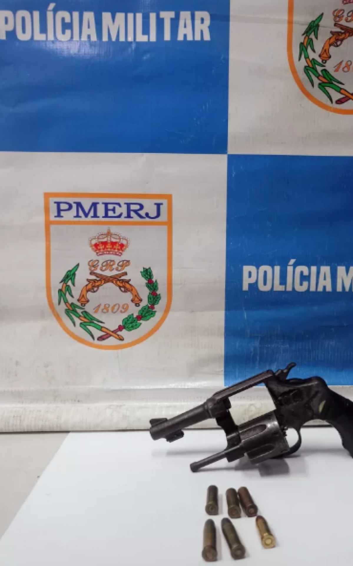Na fuga, o indivíduo abandonou o revólver calibre .32. Os policiais encontraram também três munições deflagradas, duas intactas e uma munição com falha na espoleta.