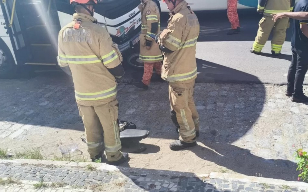 Segundo informações de testemunhas, o ônibus intermunicipal teria atropelado o motociclista. Nas imagens, dá pra ver que a moto foi parar embaixo do veículo.