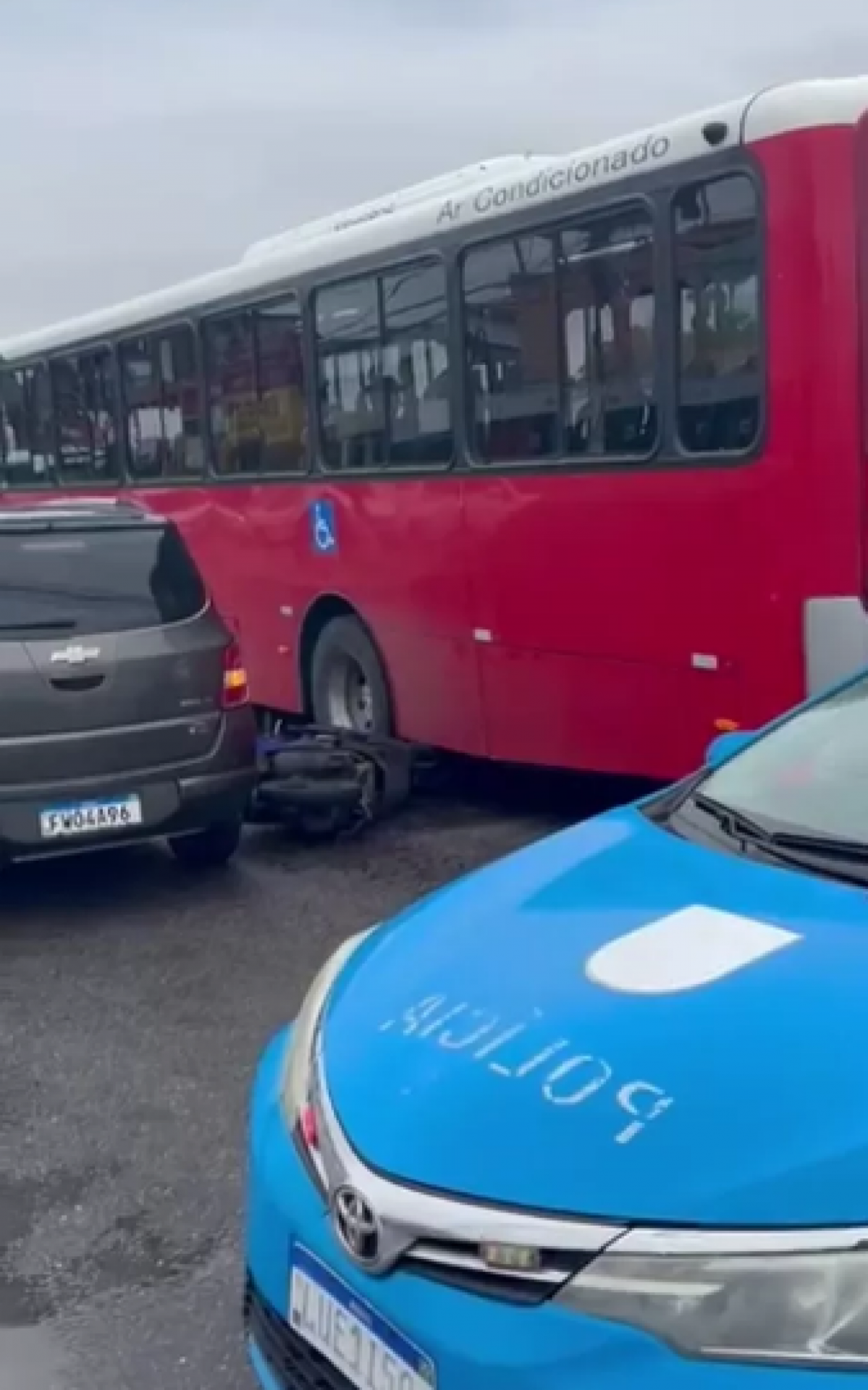 Após o impacto, a motocicleta permaneceu embaixo do ônibus, aguardando a realização da perícia.