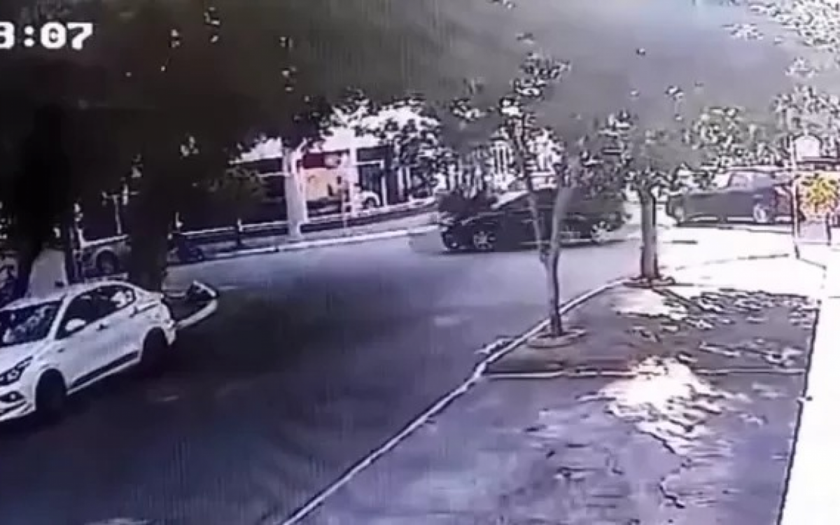 Imagens de câmeras de segurança mostram o momento em que a motocicleta é atingida pelo carro.Reprodução/