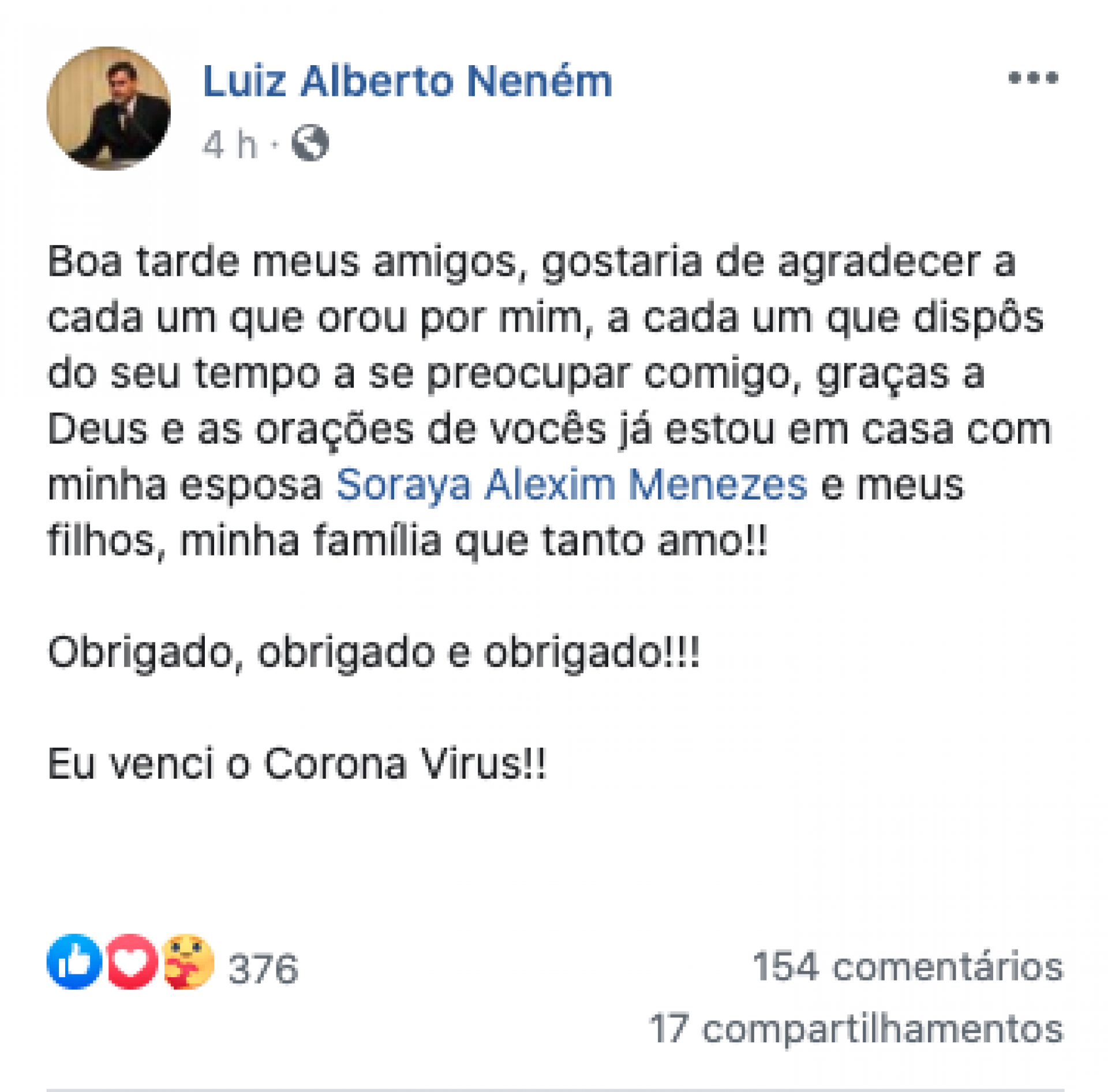 “Gostaria de agradecer a cada um que orou por mim, a cada um que dispôs do seu tempo a se preocupar comigo”, escreveu Nené, em suas redes sociais. “Graças a Deus e as orações de vocês, já estou em casa com minha esposa e meus filhos. Eu venci o coronavírus”.