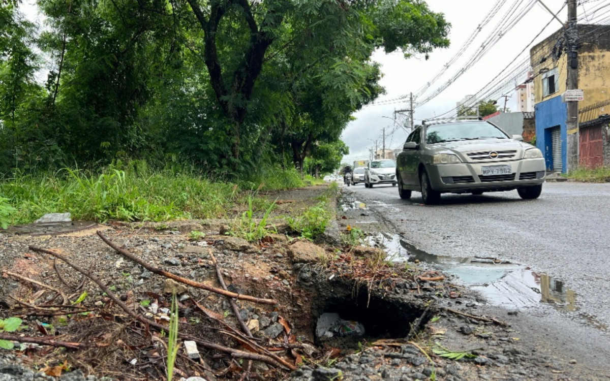 Em trechos da Beira-Valão, entre as avenidas 28 de Março e Arthur Bernardes, há vários rompimentos e buracos na pista Foto César Ferreira/Divulgação