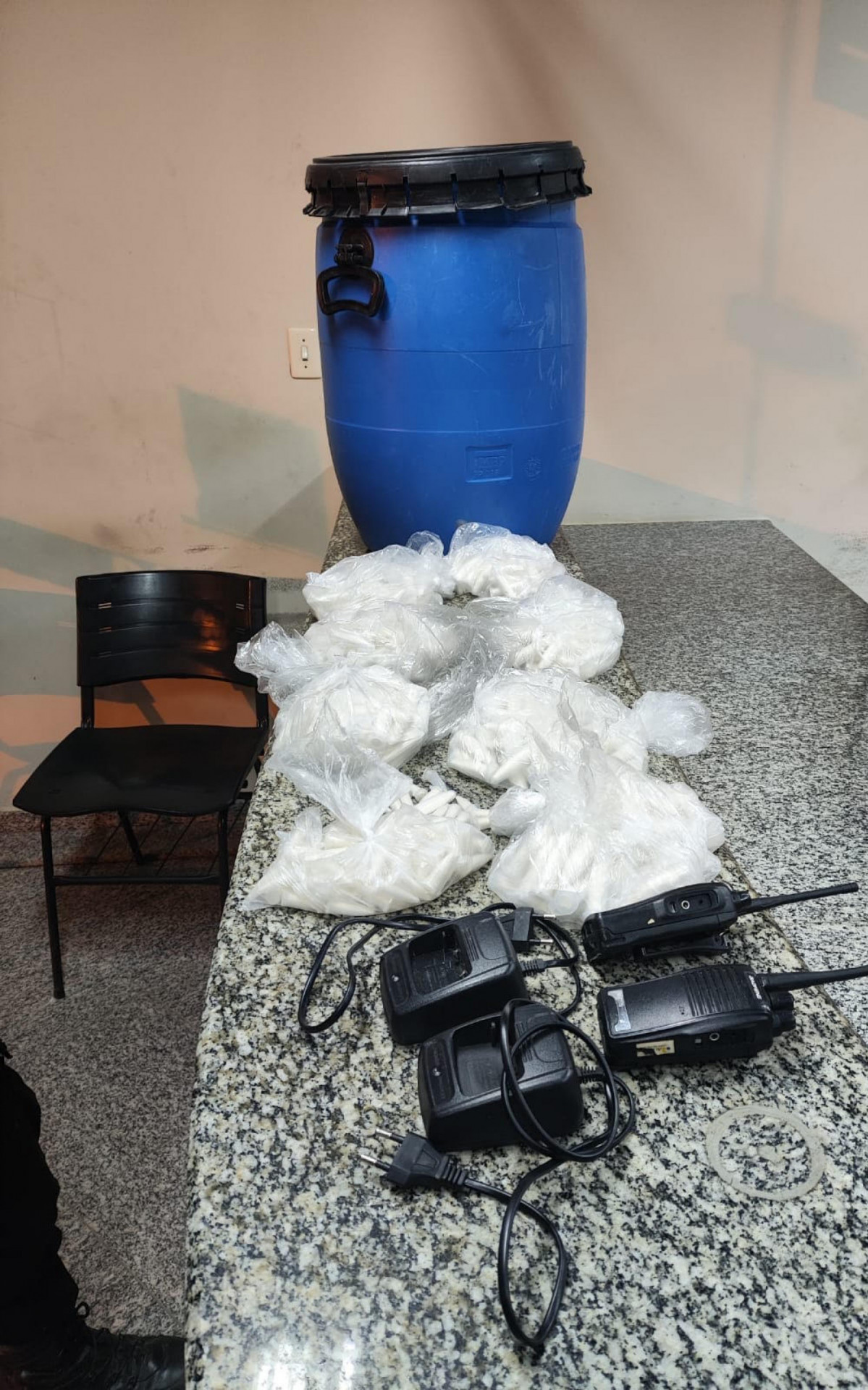 Durante um patrulhamento de rotina na região, os policiais observaram um indivíduo que entrou em um terreno e saiu carregando uma sacola. Ao abordá-lo, encontraram dois rádios transmissores, comumente utilizados pelos integrantes do tráfico para comunicação, além de R$ 19,00 em espécie. Diante da evidência de envolvimento com o tráfico local, os policiais intensificaram a busca e encontraram uma escada estrategicamente posicionada para acesso a uma laje.