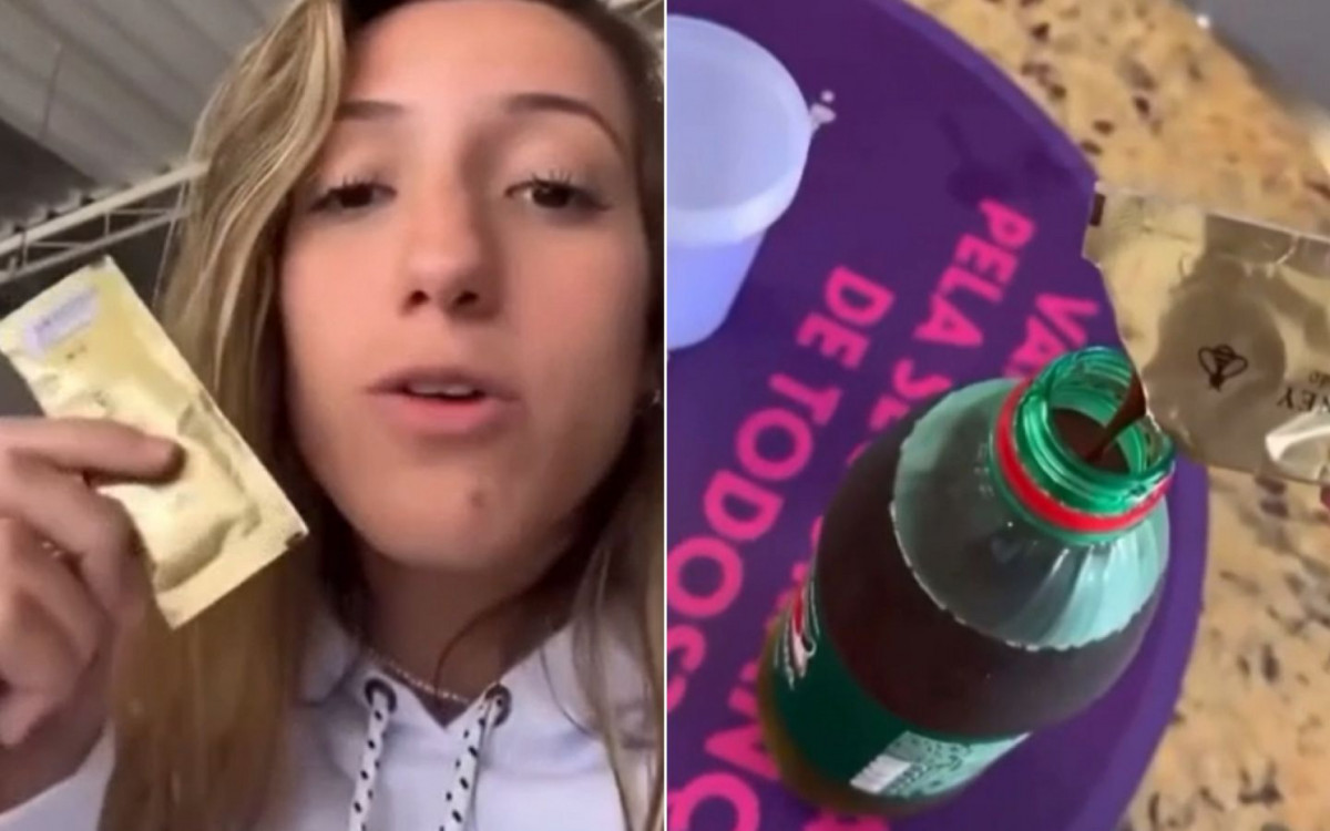 No vídeo, a estudante aparece colocando a substância em uma garrafa de refrigerante. Logo em seguida, ela oferece a bebida para os colegas e filma a reação deles. Confira:
