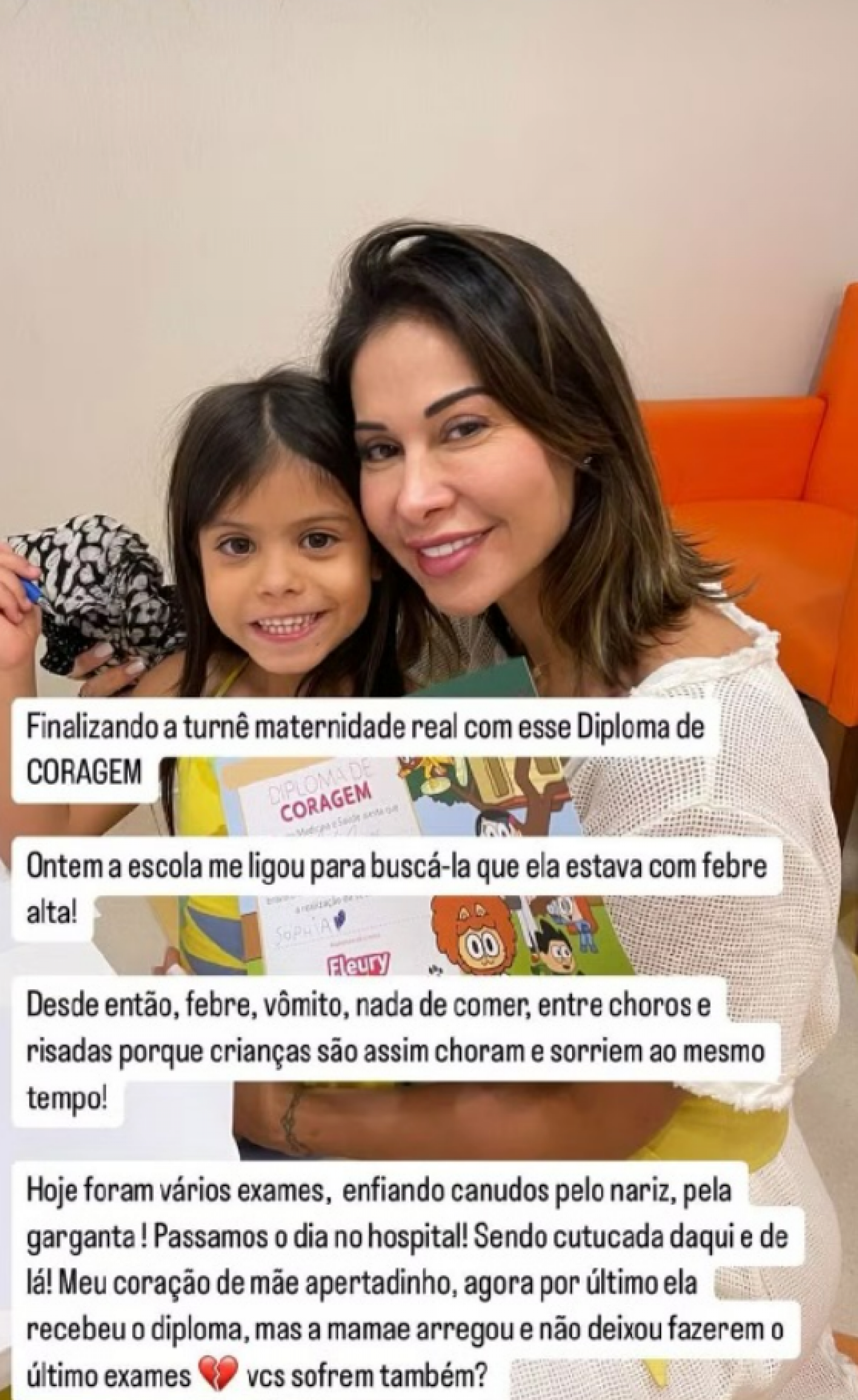 A famosa continuou, detalhando o processo: "Hoje foram vários exames, enfiando canudos pelo nariz, pela garganta! Passamos o dia no hospital, sendo cutucada daqui e de lá! Meu coração de mãe apertadinho, agora por último ela recebeu o diploma, mas a mamãe arregou e não deixou fazerem o último exame. Vocês sofrem também?", perguntou.