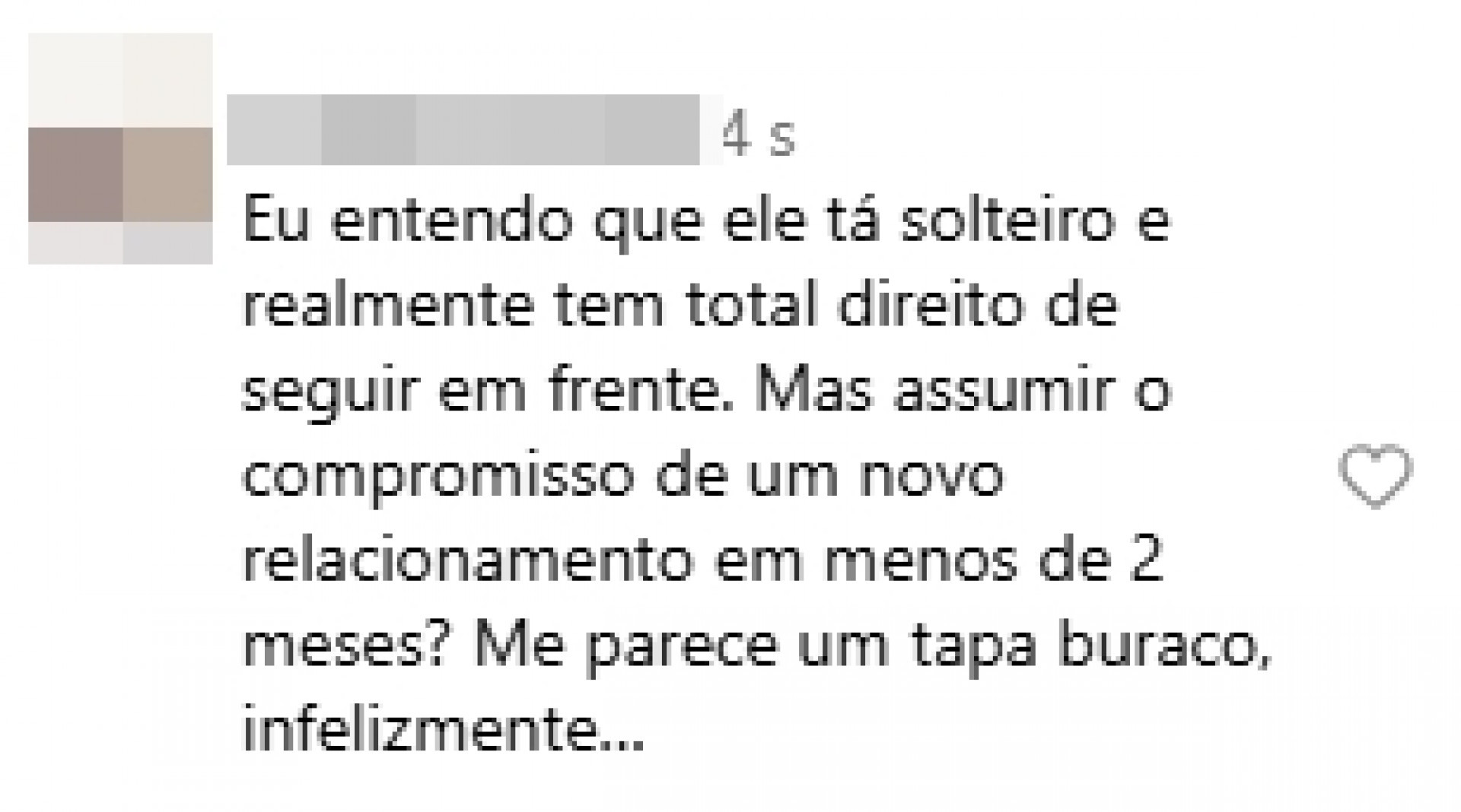 Depois que os registros se espalharam na web, alguns internautas criticaram o ex-BBB por ter seguido em frente tão rápido. "Ele se apaixona na velocidade que se desapaixona", observou uma pessoa. "Esse pessoal tem mto amor pra dar mesmo", debochou um usuário do Instagram. "Eu entendo que ele tá solteiro e realmente tem total direito de seguir em frente. Mas assumir o compromisso de um novo relacionamento em menos de 2 meses? Me parece um tapa buraco, infelizmente…", apontou uma pessoa.
