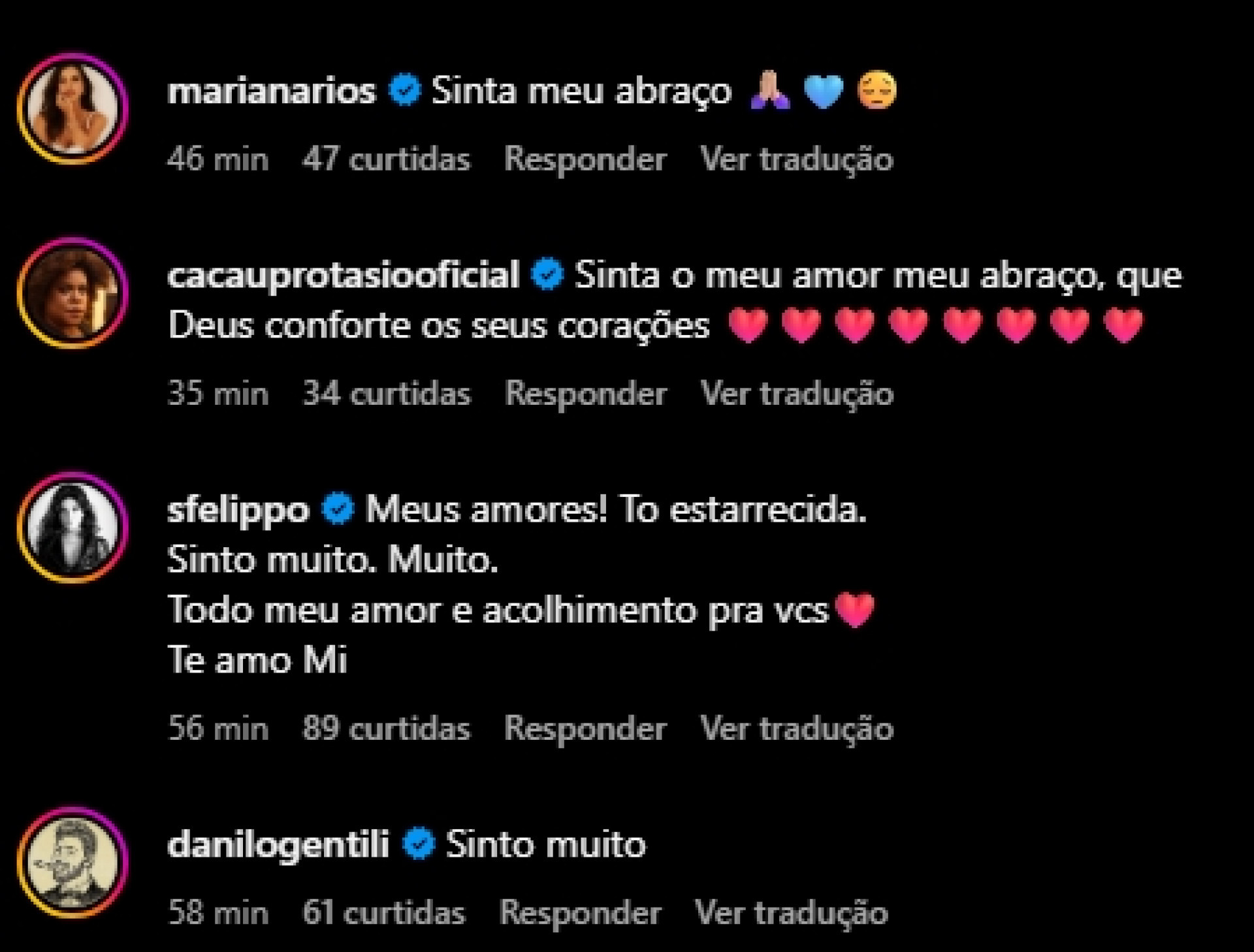 No espaço dos comentários, várias figuras públicas prestaram condolências à família. "Sinto muito", escreveu Danilo Gentili. "Meus amores! Tô estarrecida. Sinto muito. Muito. Todo meu amor e acolhimento pra vcs. Te amo, Mi", disse Samara Felippo. "Sinta o meu amor, meu abraço, que Deus conforte os seus corações", falou a atriz Cacau Protásio. "Sinta meu abraço", declarou Mariana Rios.